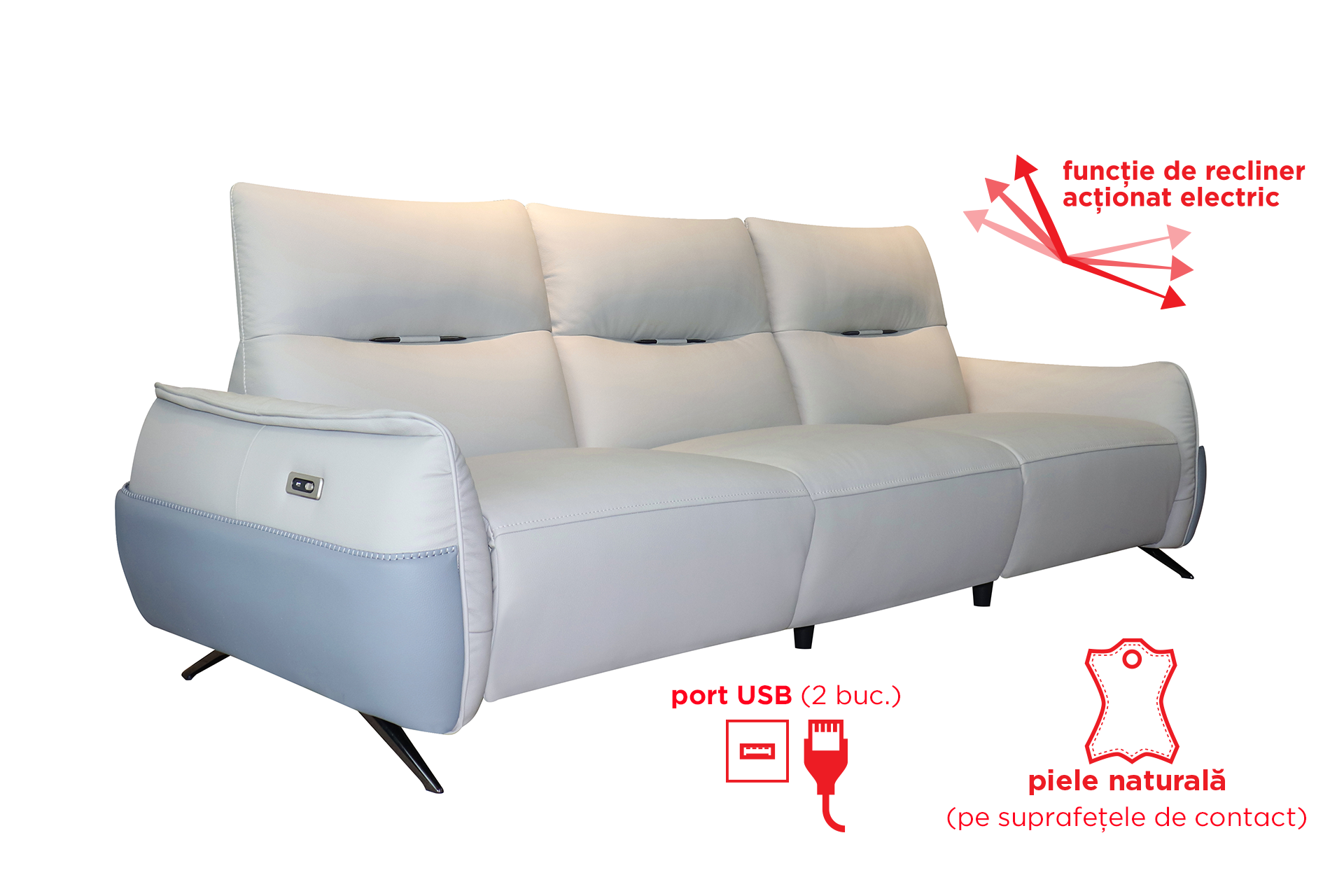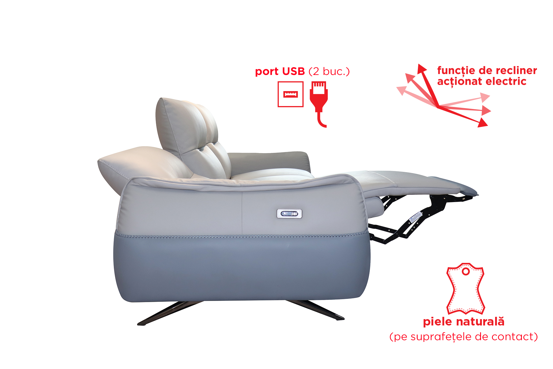 - Dotări: două reclinere electrice, tetiere reglabile, port USB, buton acționare, finisaj gri pe exteriorul brațelor, perne prevăzute cu fermoar, pentru suport lombar.