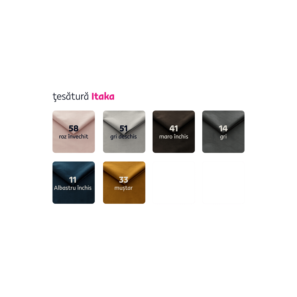 Poate fi comandat în 6 versiuni de culoare ale ţesăturii Itaka la preţul de 4 566,-. Pentru comenzi individuale, este necesar un depozit de 10% din suma dată. După plata avansului, cererea dumneavoastră va fi introdusă în producţie. Timpul de livrare 6-8 săptămâni.