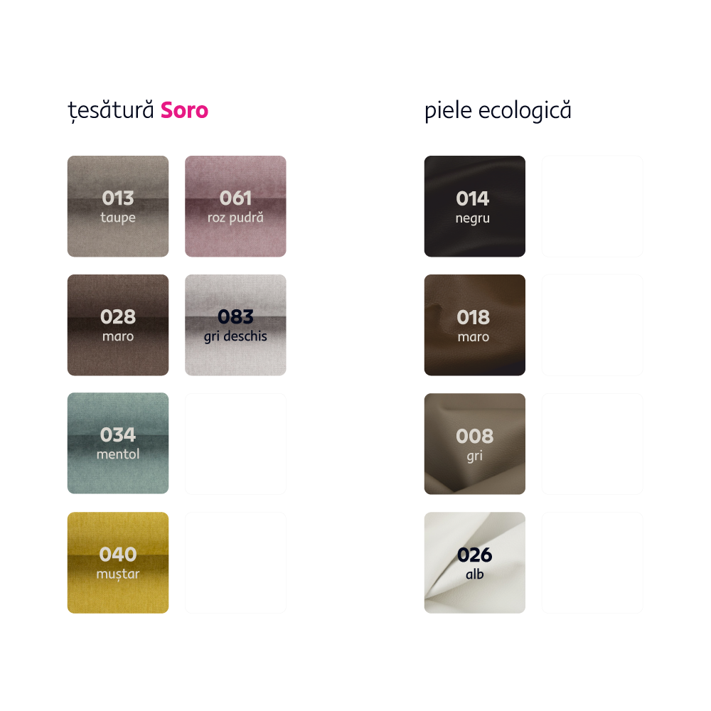 Posibilitatea de a comanda în 4 nuanŢe a pielii ecologice şi în 6 nuanŢe a materialului textil Soro la preţul 5 569,-. Pentru o comandă individuală, este necesar să plătiţi un avans de 10% din sumă. După achitarea avansului, comanda dvs. va fi dată în producţie.
