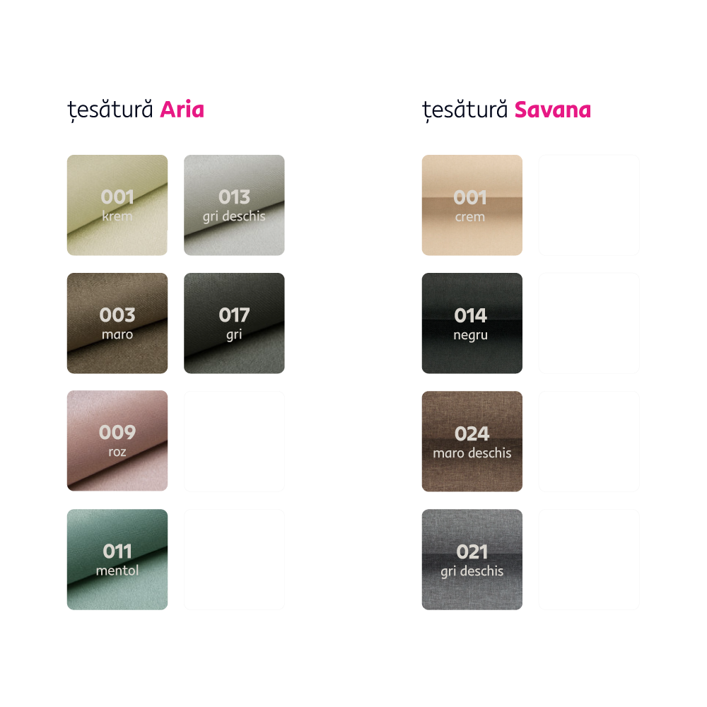 Posibilitatea de a cumpăra în 6 modele a materialului textil ARIA şi în 4 modele a materialului textil SAVANA la preţul de 6.599,-. Segotia P (fix, fără spaţiu de depozitare) se poate cumpăra la comandă în modelele de culori ilustrate. Pentru o comandă individuală, este necesar să plătiţi un avans de 10% din sumă. După achitarea avansului, comanda dvs. va fi dată în producţie. Durata de livrare este între 6-8 săptămâni.