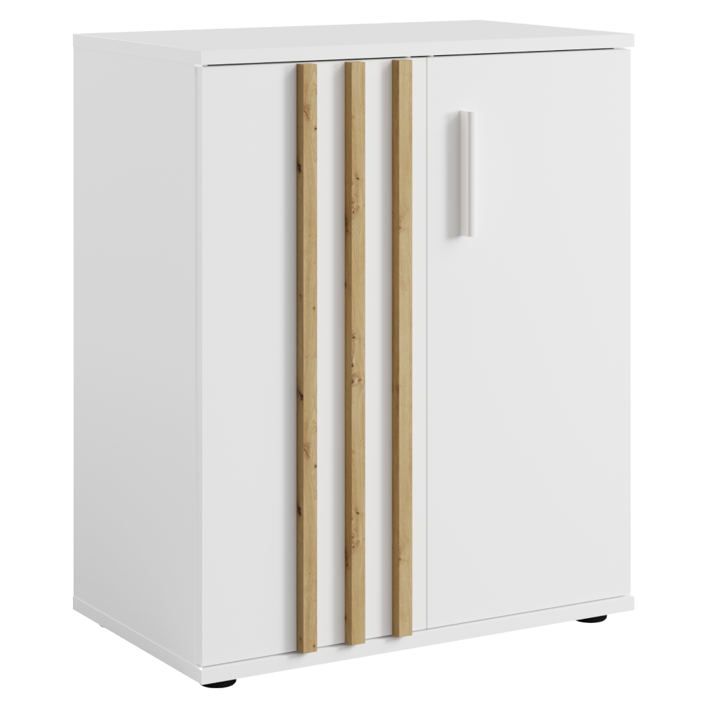 Material: DTD laminat/MDF Culoare: albă/stejar artisan Dimensiuni (lxAxh): 60x35x73 cm Grosime material: 1,6 cm Grosimea lamelei: 1,6 cm. Lăţimea lamelei: 1,8 cm Cu două uşi Cu poliţă Portanţă poliţă: 5 kg Portanţă spaţiu de depozitare: 10 kg Mâner numai pe o parte a uşii Material mâner: MDF Culoare mâner: alb Livrat cu lamele decorative Stil modern Livrat dezasamblat