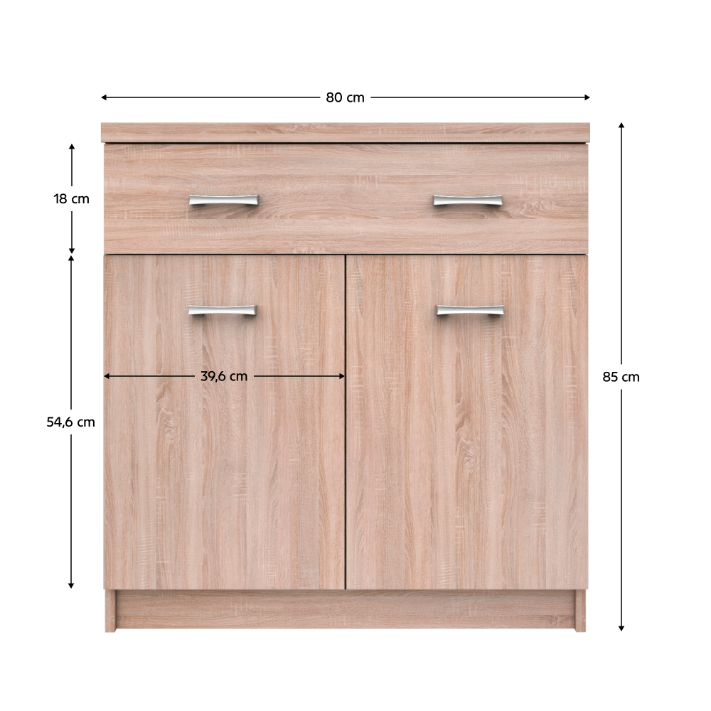 Comodă 2D1S TOPTY TIP 19 Material: PAL melaminat Culoare: stejar Sonoma Dimensiuni (LxAxÎ): 80x33x85 cm Dimensiuni uşă (LxL): 39,6x54,6 cm Dimensiuni sertar (LxL): 80x18 cm 2 uşi Un sertar Raft Livrat dezasamblat