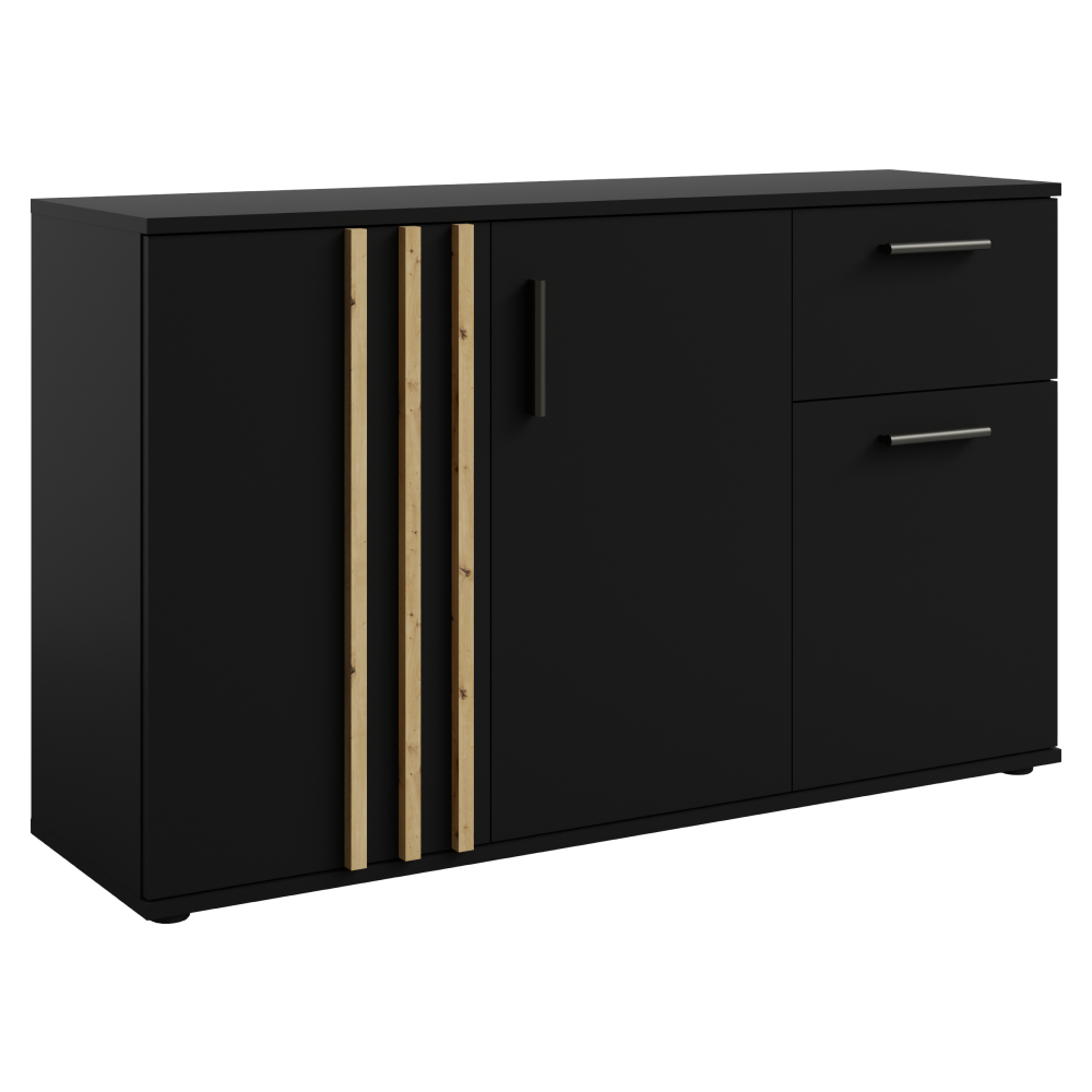 Material: DTD laminat/MDF Culoare: neagră/stejar artisan Dimensiuni (lxAxh): 120x35x73 cm Grosime material: 1,6 cm Grosimea lamelei: 1,6 cm. Lăţimea lamelei: 1,8 cm Cu două uşi Cu poliţă Portanţă poliţă: 5 kg Portanţă spaţiu de depozitare: 10 kg Mâner numai pe o parte a uşii Material mâner: MDF Culoare mâner: neagră Livrat cu lamele decorative Stil modern Livrat dezasamblat