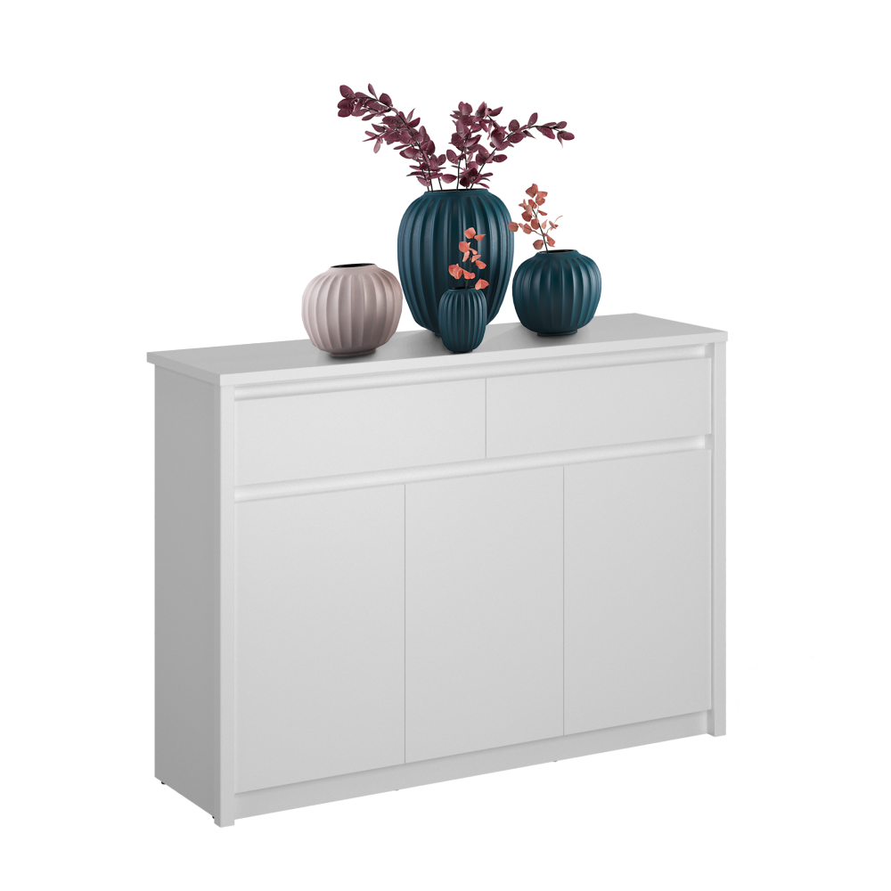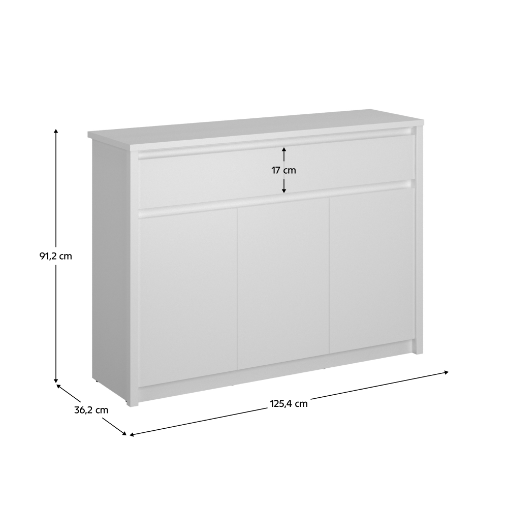 Material: PAL melaminat / muchii din ABS Culoare: albă Dimensiuni (LxAxÎ): 125,4x36,2x91,2 cm Grosimea materialului: 1,6-3,2 cm Dulap cu trei uşi Cu rafturi Capacitatea de încărcare a rafturilor: 5 kg Două sertare Înălţime sertar: 17 cm Picioare de plastic Design modern Livrată dezasamblată