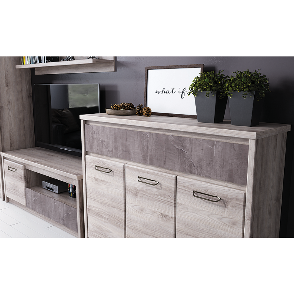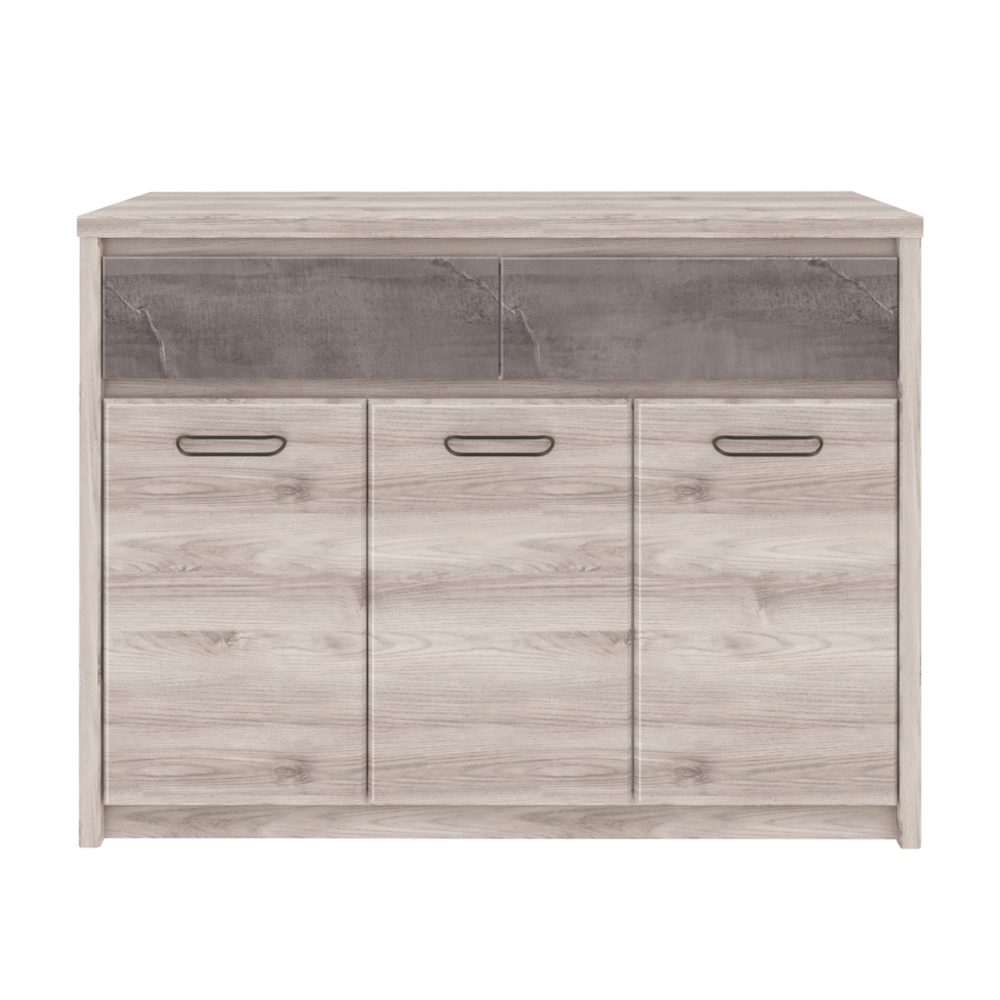 Material: PAL melaminat Culoare: castan Nairobi / onix Dimensiuni (LxAxÎ): 126,6x95,2x40,3 cm Grosimea materialului: 1,6-3,2 cm Picioare din plastic Mânere metalice Culoarea mânerelor: neagră Trei uşi Două sertare Capacitate sertare: 5 kg Design modern Livrată dezasamblată