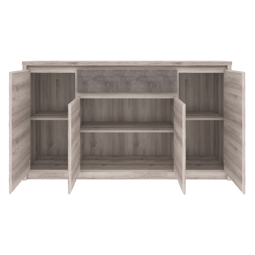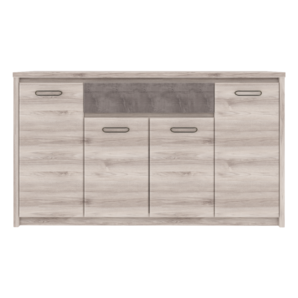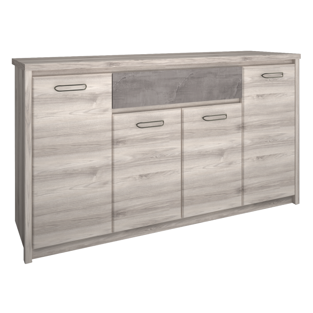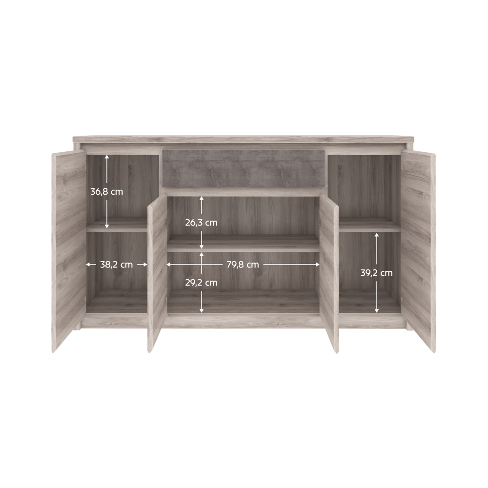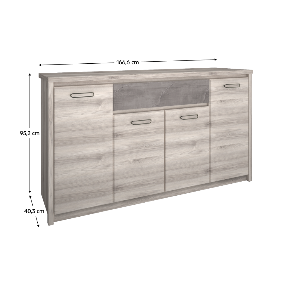Material: PAL melaminat Culoare: castan Nairobi / onix Dimensiuni (LxAxÎ): 166,6x95,2x40,3 cm Grosimea materialului: 1,6-3,2 cm Picioare din plastic Mânere metalice Culoarea mânerelor: neagră Cu patru uşi Rafturi Sertar Capacitate sertar: 5 kg Design modern Livrată dezasamblată