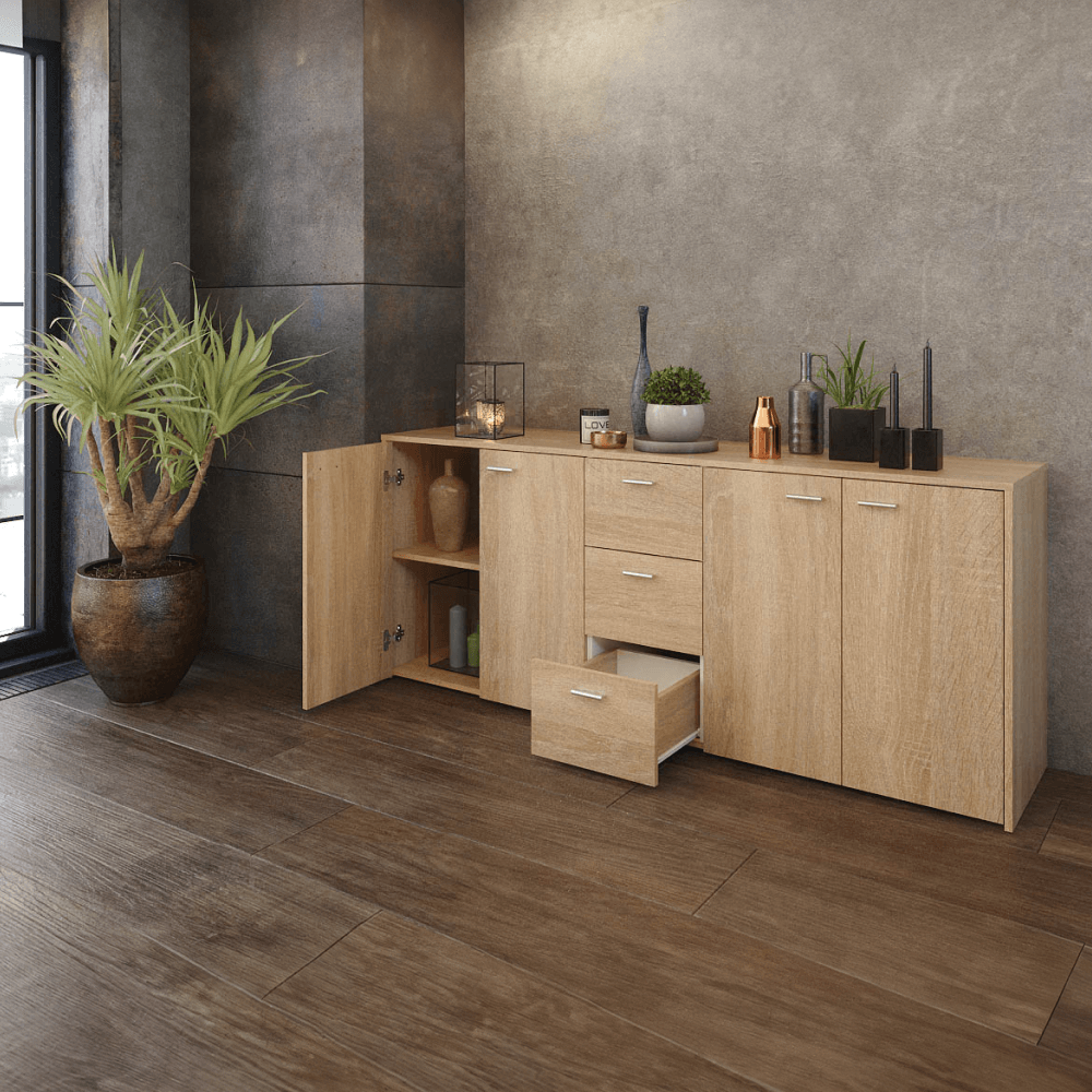 Material: PAL melaminat Culoare: stejar sonoma Dimensiuni (LxAxÎ): 180x42x74,5 cm Grosime material: 1,6 cm Cu rafturi Cu patru uşi Trei sertare Cu mânere din plastic Culoarea mânerelor: argintie Capacitatea de încărcare a raftului superior: 10 kg Capacitatea de încărcare a rafturilor interne: 5 kg Capacitatea de încărcare a sertarelor: 5 kg Glisoare din plastic Vă recomandăm să ataşaţi mobilierul de perete Produs slovac de calitate Livrat dezasamblat
