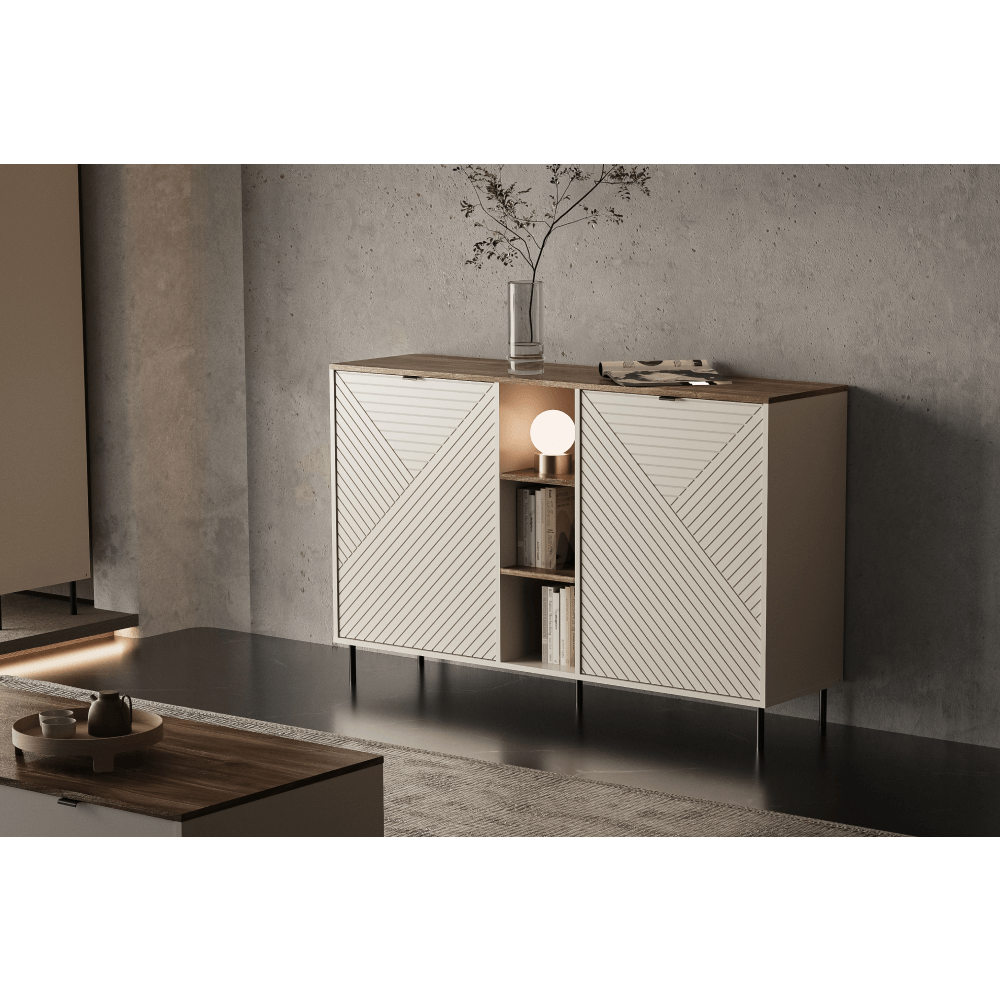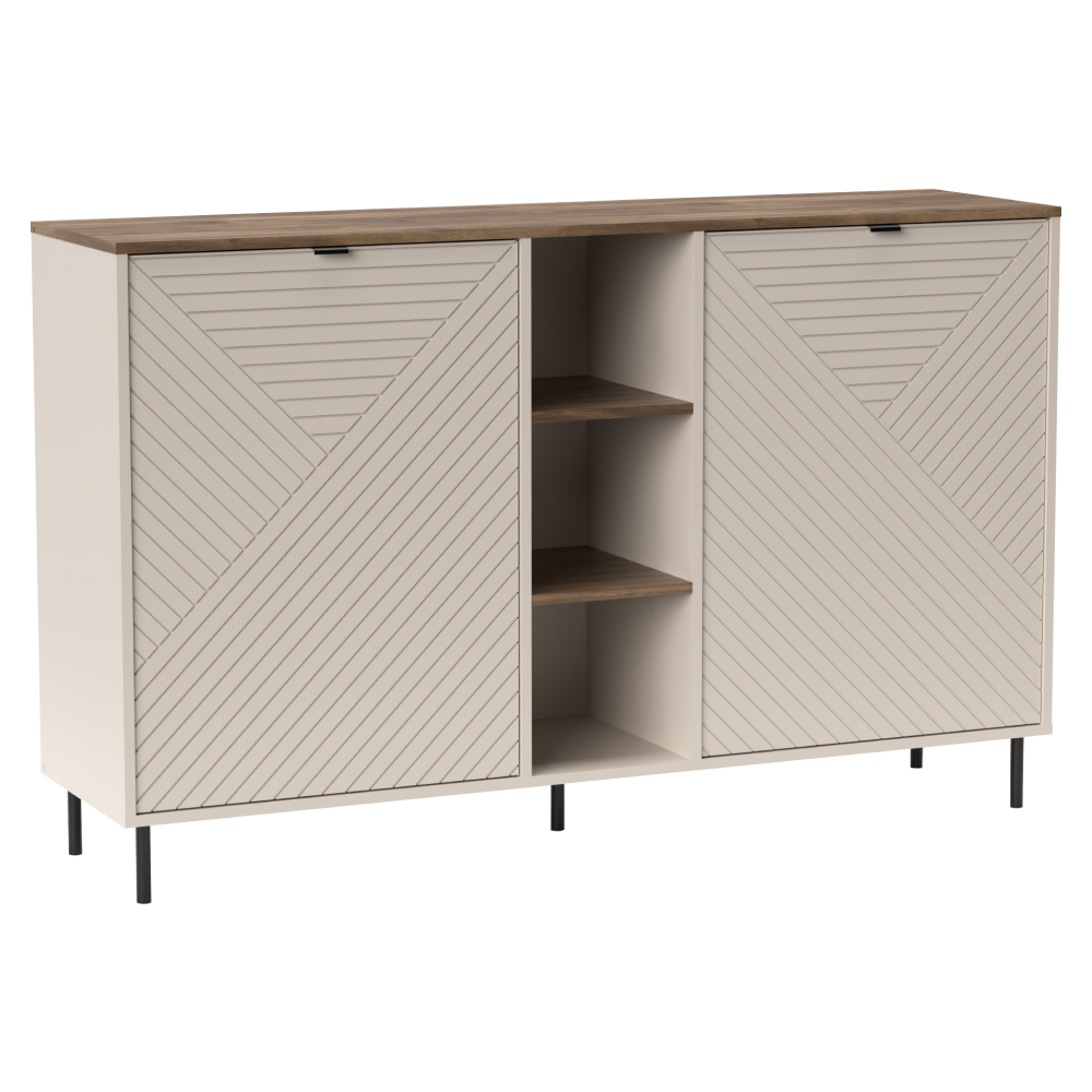 Material: DTD laminat/MDF înfoliat/margini ABS Culoare: caşmir/stejar castello Dimensiuni (Lxlxh): 153,4x40x95,4 cm Grosimea materialului: 1,6 cm Cu două uşi Două dulăpioare Dimensiuni dulăpior (Lxh): 59,6x79,7 cm Spaţiu de depozitare deschis Poliţe Cu prindere Cu mânere Materialul mânerelor: metal Culoare mânere: neagră Pe picioare Materialul picioarelor: metal Culoarea picioarelor: neagră Înălţimea picioarelor: 12 cm Portanţă placă superioară: 10 kg Portanţa poliţă: 5 kg Uşi decorative Design modern Vă recomandăm să-l fixaţi de perete Livrat dezasamblat
