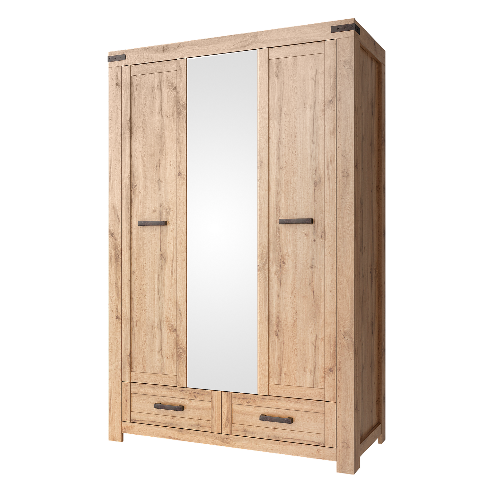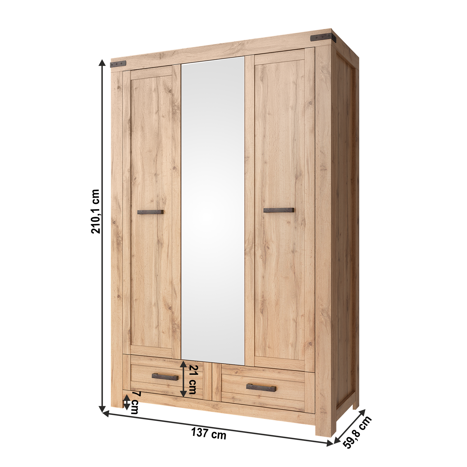 Dulap cu oglindă Moratiz 3D2S Material: DTD laminat/ MDF/ plastic/ sticlă Culoare: stejar wotan Dimensiuni (LxlxÎ): 137x59,8x210,1 cm Înălţimea picioarelor este de 7 cm Grosimea materialului: 1,6 - 2,2 cm Combinat Cu trei uşi Două dulapuri Dulapul are un suport pentru haine şi rafturi Înălţime sertare: 21 cm Decor şi mânere din plastic Uşă din MDF Livrat dezasamblat