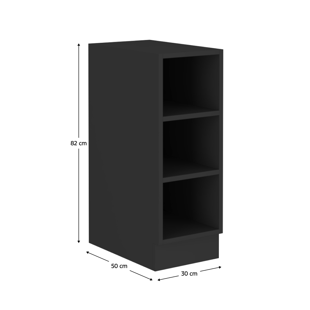 Material: DTD laminat Culoare: negru mat Dimensiuni (Lxlxh): 30x50x82 cm Grosime material: 1,6 cm Rafturi Cu şină de jos /soclu Fără blat de lucru Design modern Cu opţiunea de a cumpăra chiuveta universală LAY ON. Livrat dezasamblat Dulapurile inferioare includ şina inferioară, fără blat de lucru. Opţiunea de a achiziţiona blat de lucru din marmură roma la preţul de 339 Lei/ml. Opţiunea de a achiziţiona o chiuvetă universală LAY ON.