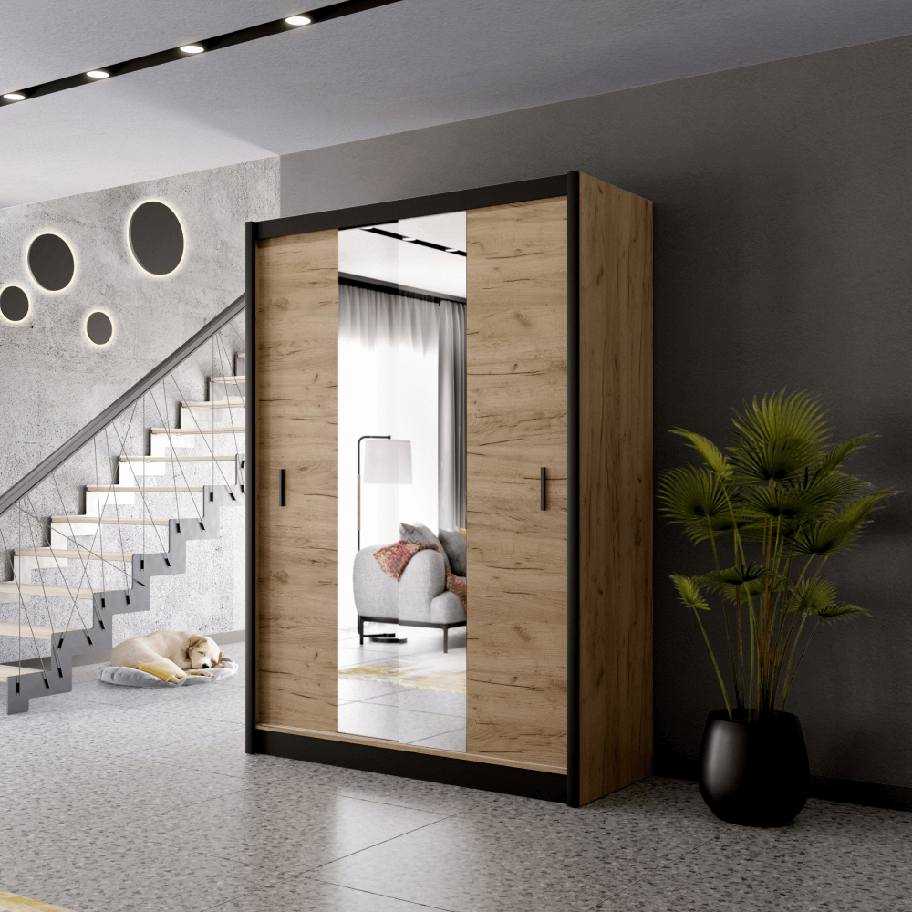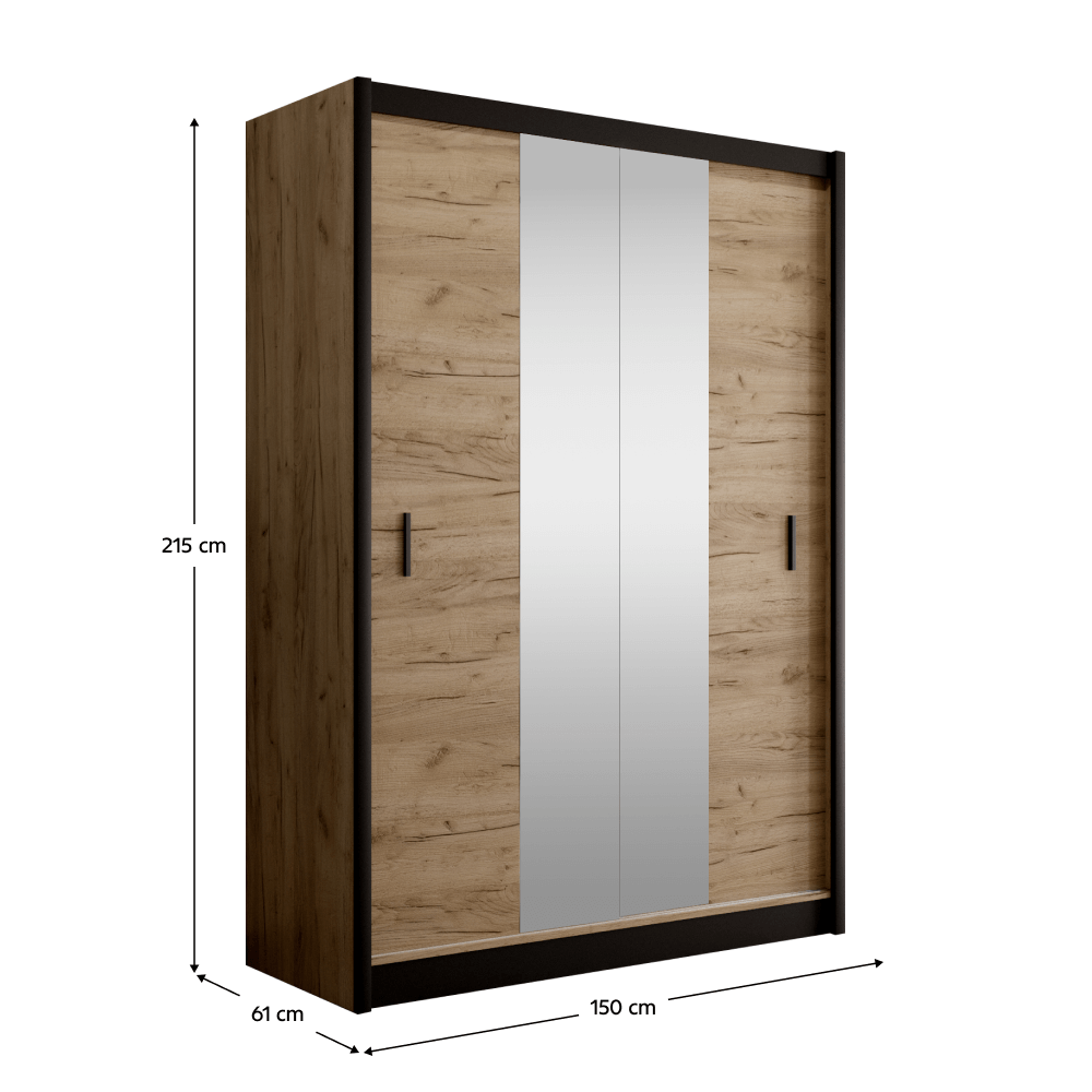 Material: PAL melaminat / margini ABS / fâşii MDF / sticlă Culoare: neagră / stejar craft Dimensiuni (LxAxÎ): 150x61x215 cm Grosimea PAL: 1,6 cm Grosime ABS: 0,045 cm Capacitatea de încărcare a raftului: 10 kg Capacitatea de încărcare a raftului lung: 20 kg Capacitate de încărcare a barei pentru umeraşe: 15 kg Capacitate sertar: 3 kg Cu uşi glisante Cu mânere Cu oglindă Zonă cu rafturi Bară pentru umeraşe Uşă dublă Livrat dezasamblat