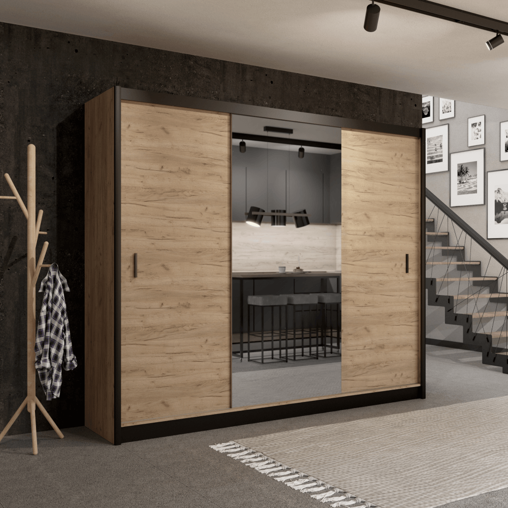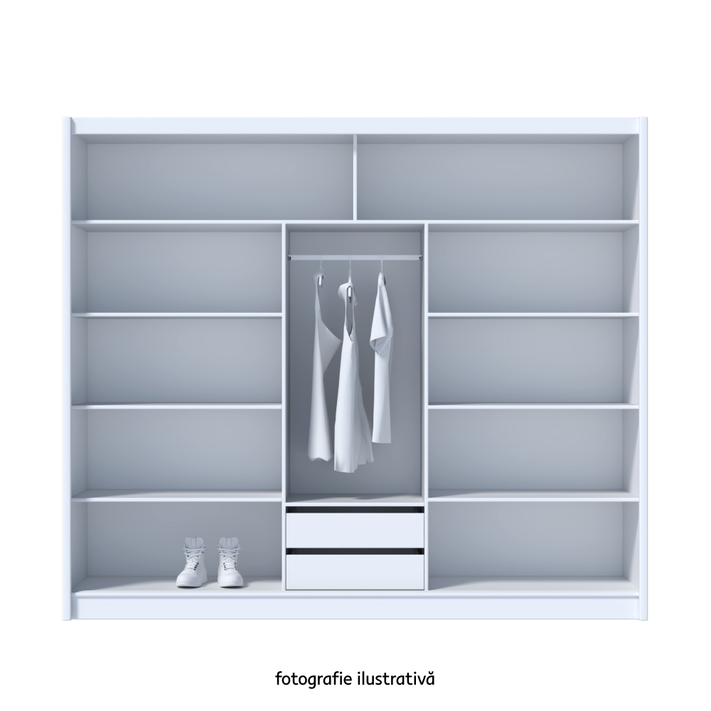 Material: PAL melaminat / margini ABS / fâşii MDF / sticlă Culoare: neagră / stejar craft Dimensiuni (LxAxÎ): 250x61x215 cm Grosime PAL: 1,6 cm Grosime ABS: 0,045 cm Capacitatea de încărcare a raftului: 10 kg Capacitatea de încărcare a raftului lung: 20 kg Capacitate de încărcare a barei pentru umeraşe: 15 kg Capacitate sertar: 3 kg Cu uşi glisante Cu mânere Cu oglindă Zonă cu rafturi Bară pentru umeraşe Uşă dublă Livrat dezasamblat
