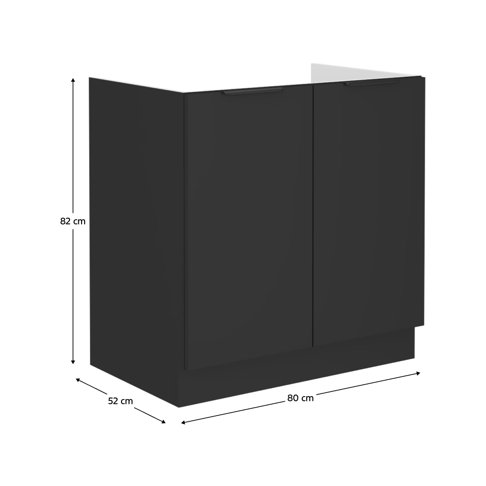 Material: DTD laminat Culoarea uşii: negru Culoarea corpului: negru mat Dimensiuni (Lxlxh): 80x52x82 cm Grosime material: 1,6 cm Uşă dublă Cu mâner Culoarea mânerului: aluminiu Cu plintă inferioară/soclu Design modern Fără blat de lucru Livrat fără chiuvetă Sistem de închidere silenţioasă a uşii Poate fi achiziţionată chiuveta universală LAY ON Livrat dezasamblat Dulapurile din sectorul inferior sunt livrate cu şină inferioară (plintă), fără blat de lucru. Blatul de lucru cu o grosime de 3,8 cm poate fi comandat separat în finisaj de tip stejar artisan la preţul de 339 EUR/ml.