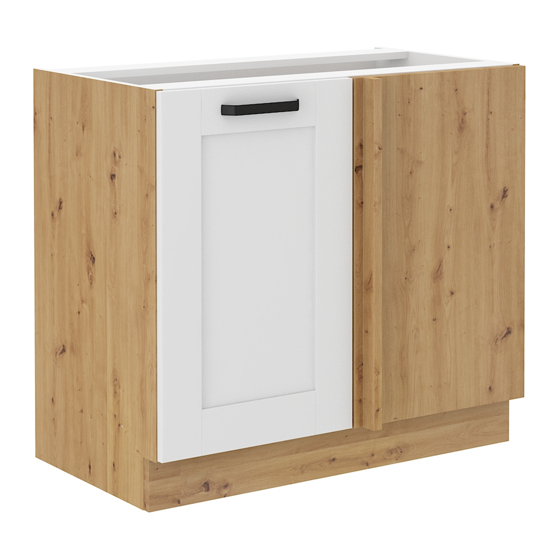 Dulap inferior LULA 105 ND 1F BB Material: laminat HDF/MDF Culoare: albă/stejar artisan Dimensiuni (LxAxÎ): 90x52x82 cm Grosime material: 1,6 cm Grosime uşă: 2 cm Unitate de depozitare proiectată pentru colţul mobilierului de bucătărie. Dulapul trebuie instalat la 15 cm distanţă de perete. În cazul montării corecte a unităţii în mobilierul de bucătărie, lăţimea sa totală de la dreapta la stânga, inclusiv cu blatul de lucru, este de 105 cm. Cu o uşă, Cu mâner metalic, Culoarea mânerului: neagră, Cu şină inferioară/plintă, Sistem de închidere silenţioasă a uşii, Uşi monta sertarele pe partea dreaptă sau stângă, Design dinamic modern, Se livrează dezasamblat. Dulapurile inferioare sunt furnizate împreună cu şina inferioară, Fără blat de lucru. Opţiunea de a achiziţiona blat de lucru din stejar artisan sau marmură roma la preţul de 319/metru liniar. Opţiunea de a achiziţiona o chiuvetă universală LAY ON.