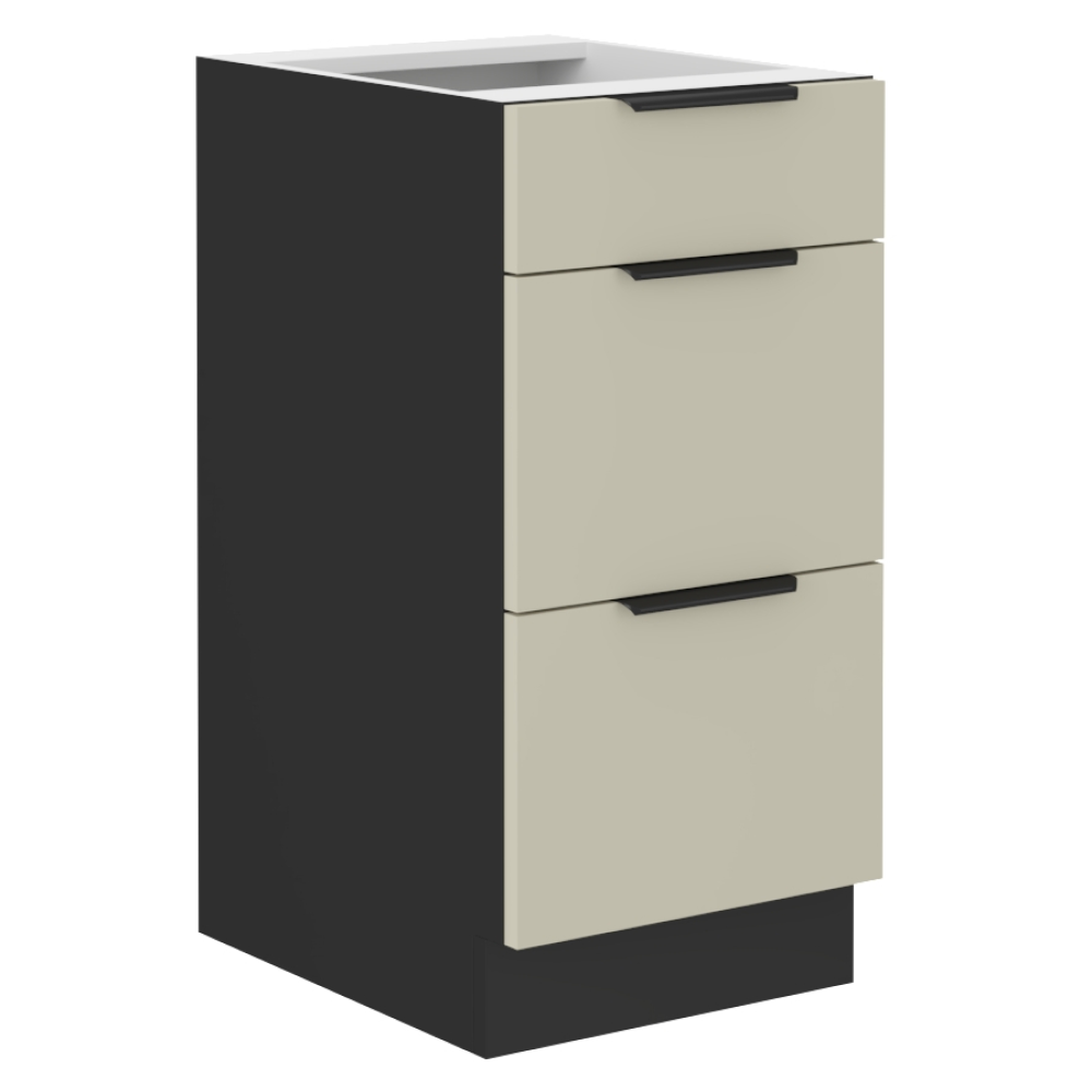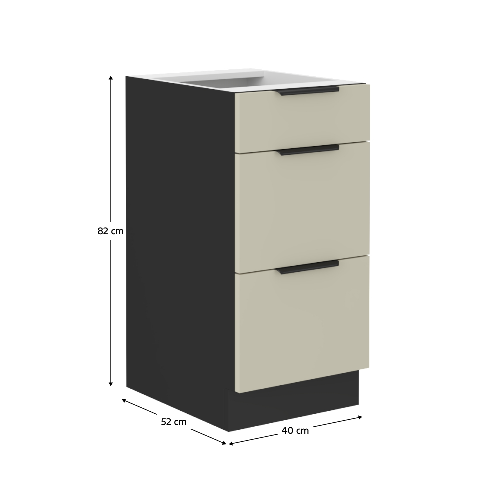 Material: DTD laminat Culoarea uşii: caşmir Culoarea dulapului: negru mat Dimensiuni (Lxlxh): 40x52x82 cm Grosime material: 1,6 cm Cu sertare 3 rafturi Cu mâner Culoare mâner: aluminiu Fără blat de lucru Cu închidere silenţioasă a sertarului Sertar de tipul PREMIUM-BOX cu lateralele din oţel Cu opţiunea de a cumpăra chiuveta universală LAY ON Se livrează dezasamblat Dulapurile inferioare sunt livrate cu şină inferioară inclusă, fără blat. Opţiunea de a achiziţiona blat de lucru din marmură roma la preţul de 339 Lei/ml. Opţiunea de a achiziţiona o chiuvetă universală LAY ON.