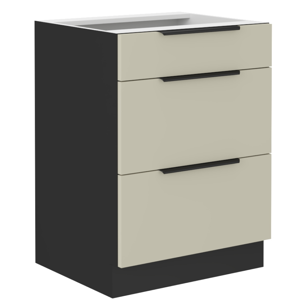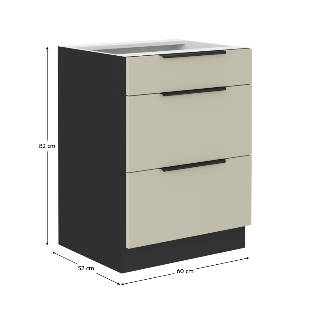 Material: DTD laminat Culoarea uşii: caşmir Culoarea dulapului: negru mat Dimensiuni (Lxlxh): 60x52x82 cm Grosime material: 1,6 cm Cu sertare 3 rafturi Cu mâner Culoare mâner: aluminiu Fără blat de lucru Cu închidere silenţioasă a sertarului Sertar de tipul PREMIUM-BOX cu lateralele din oţel Cu opţiunea de a cumpăra chiuveta universală LAY ON Se livrează dezasamblat Dulapurile inferioare sunt livrate cu şină inferioară inclusă, fără blat. Opţiunea de a achiziţiona blat de lucru din marmură roma la preţul de 339 Lei/ml. Opţiunea de a achiziţiona o chiuvetă universală LAY ON.