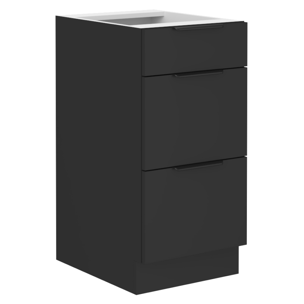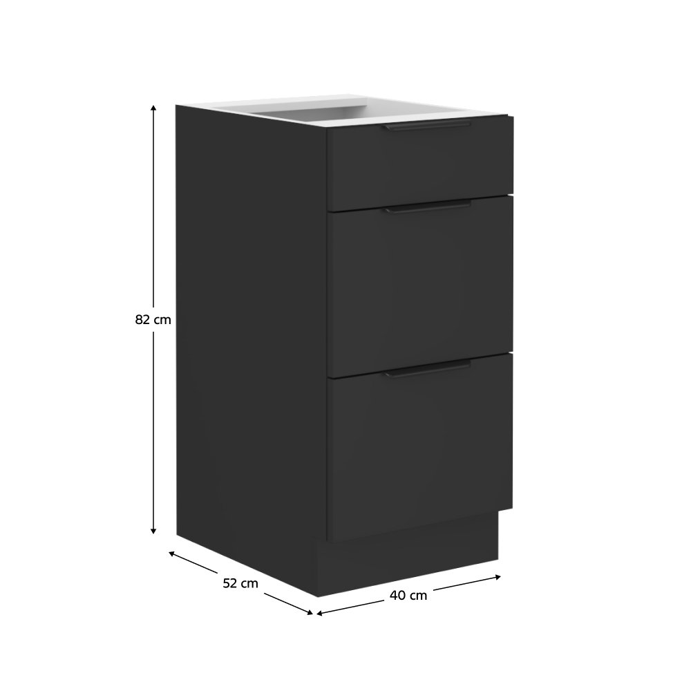 Material: DTD laminat Culoarea uşii: negru Culoarea corpului: negru mat Dimensiuni (Lxlxh): 40x52x82 cm Grosime material: 1,6 cm Cu sertare Cu mâner Culoarea mânerului: aluminiu Fără blat Cu şină inferioară/plintă Sistem de oprire silenţioasă a sertarului Sertar PREMIUM BOX cu lateralele din oţel Design modern Se poate fi achiziţiona chiuveta universală LAY ON Se livrează dezasamblate Dulapurile modulare inferioare sunt livrate cu şină inferioară (plintă), fără blat. Blatul de lucru cu o grosime de 3,8 cm poate fi comandat separat în finisaj de tip stejar artisan la preţul de 339 EUR/ml.