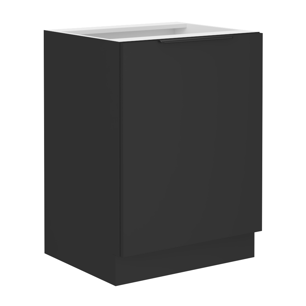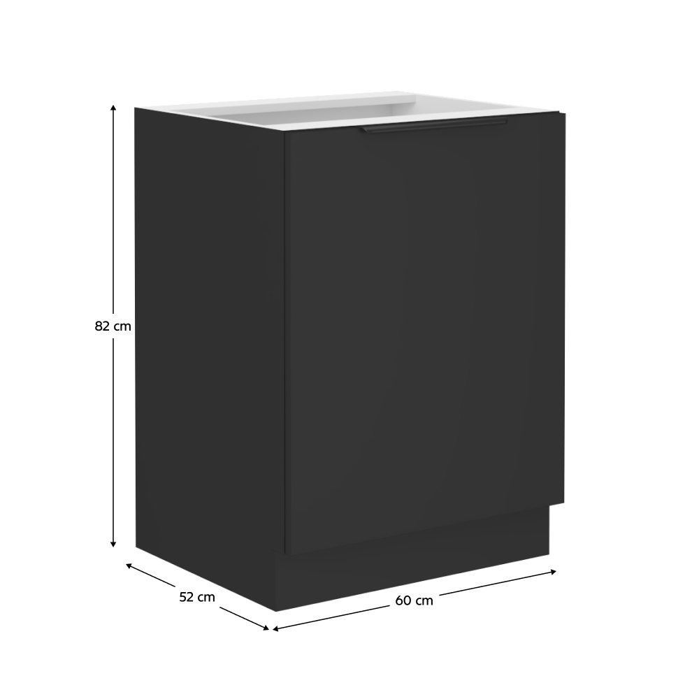 Material: DTD laminat Culoarea uşii: negru Culoarea corpului: negru mat Dimensiuni (Lxlxh): 60x52x82 cm Grosime material: 1,6 cm Cu uşi Cu poliţe Cu mâner Culoare mâner: aluminiu Fără blat Cu şină inferioară/plintă Sistem de închidere silenţioasă a uşilor Design modern Se poate achiziţiona chiuveta universală LAY ON Se livrează dezasamblate Dulapurile din modularul inferior sunt livrate cu şină inferioară (plintă), fără blat. Blatul de lucru cu o grosime de 3,8 cm poate fi comandat separat în finisaj de tip stejar artisan la preţul de 339 EUR/ml.