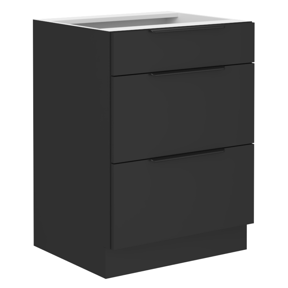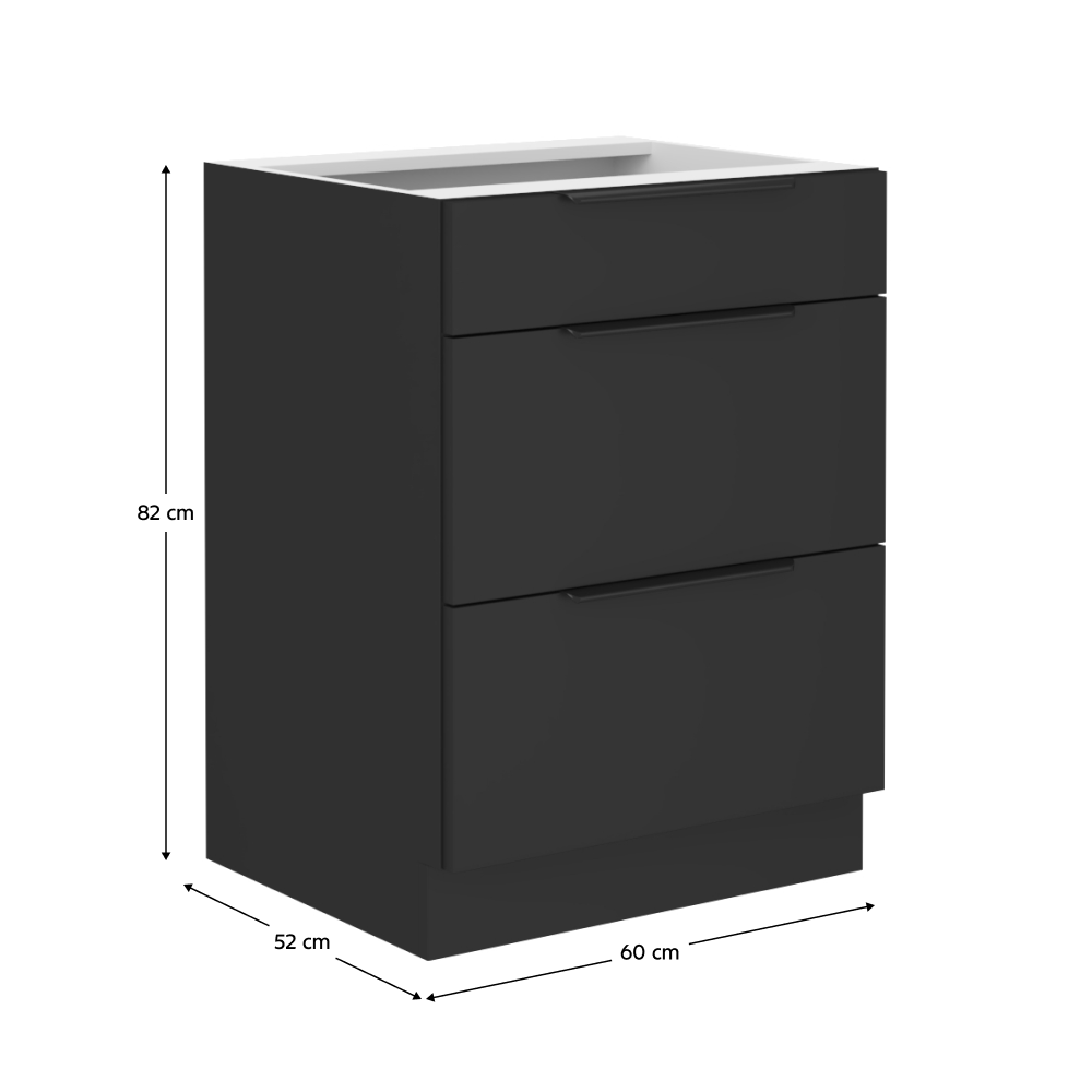 Material: DTD laminat Culoarea uşii: negru Culoarea corpului: negru mat Dimensiuni (Lxlxh): 60x52x82 cm Grosime material: 1,6 cm 3 sertare Cu mâner Culoarea mânerului: aluminiu Fără blat Cu şină inferioară/plintă Sistem de oprire silenţioasă a sertarelor Sertar tip PREMIUM BOX cu pereţi din oţel Design modern Se poate achiziţiona chiuveta universală LAY ON Se livrează dezasamblate Dulapurile din sectorul inferior sunt livrate cu şină inferioară (plintă), fără blat. Blatul de lucru cu o grosime de 3,8 cm poate fi comandat separat în finisaj de tip stejar artisan la preţul de 339 EUR/ml.