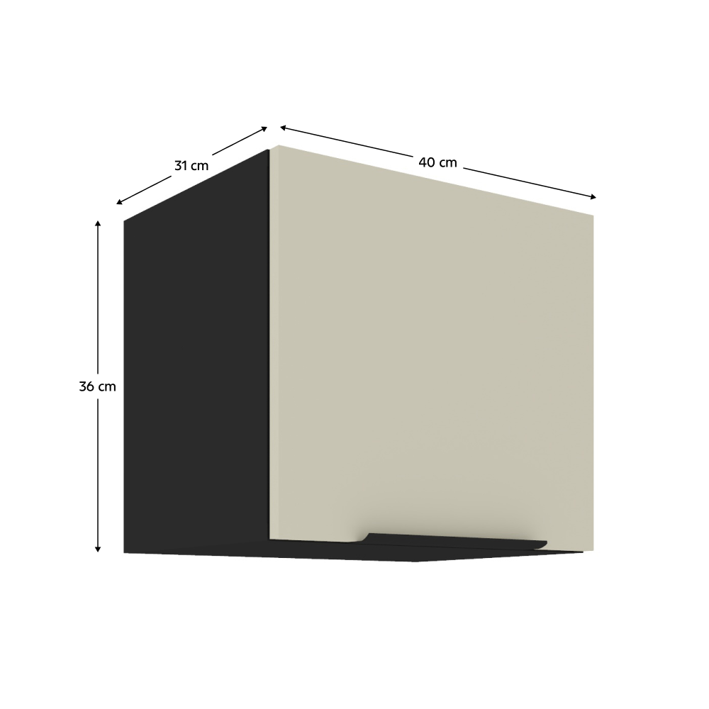 Material: DTD laminat Culoarea uşii: caşmir Culoarea dulapului: negru mat Dimensiuni (Lxlxh): 40x31x36 cm Grosime material: 1,6 cm Cu o uşă, Cu uşă, Uşi batante Cu sistem de închidere silenţioasă a uşii, Cu mâner metalic, Culoarea mânerului: aluminiu, Design modern, Livrat dezasamblat, Dulapurile inferioare sunt furnizate împreună cu şina inferioară, fără blat de lucru. Opţiunea de a achiziţiona blat de lucru din marmură roma la preţul de 339 Lei/ml. Opţiunea de a achiziţiona o chiuvetă universală LAY ON.