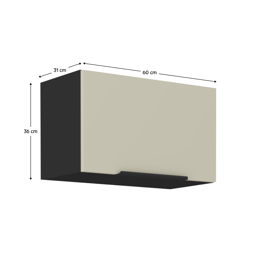 Material: DTD laminat Culoarea uşii: caşmir Culoarea dulapului: negru mat Dimensiuni (Lxlxh): 60x31x36 cm Grosime material: 1,6 cm Uşă cu balamale, Cu uşă, Cu sistem de închidere silenţioasă a uşii, Cu mâner metalic, Culoarea mânerului: aluminiu, Design dinamic modern, Livrat dezasamblat, Dulapurile inferioare sunt furnizate împreună cu şina inferioară, fără blat de lucru. Opţiunea de a achiziţiona blat de lucru din marmură roma la preţul de 339 Lei/ml. Opţiunea de a achiziţiona o chiuvetă universală LAY ON.