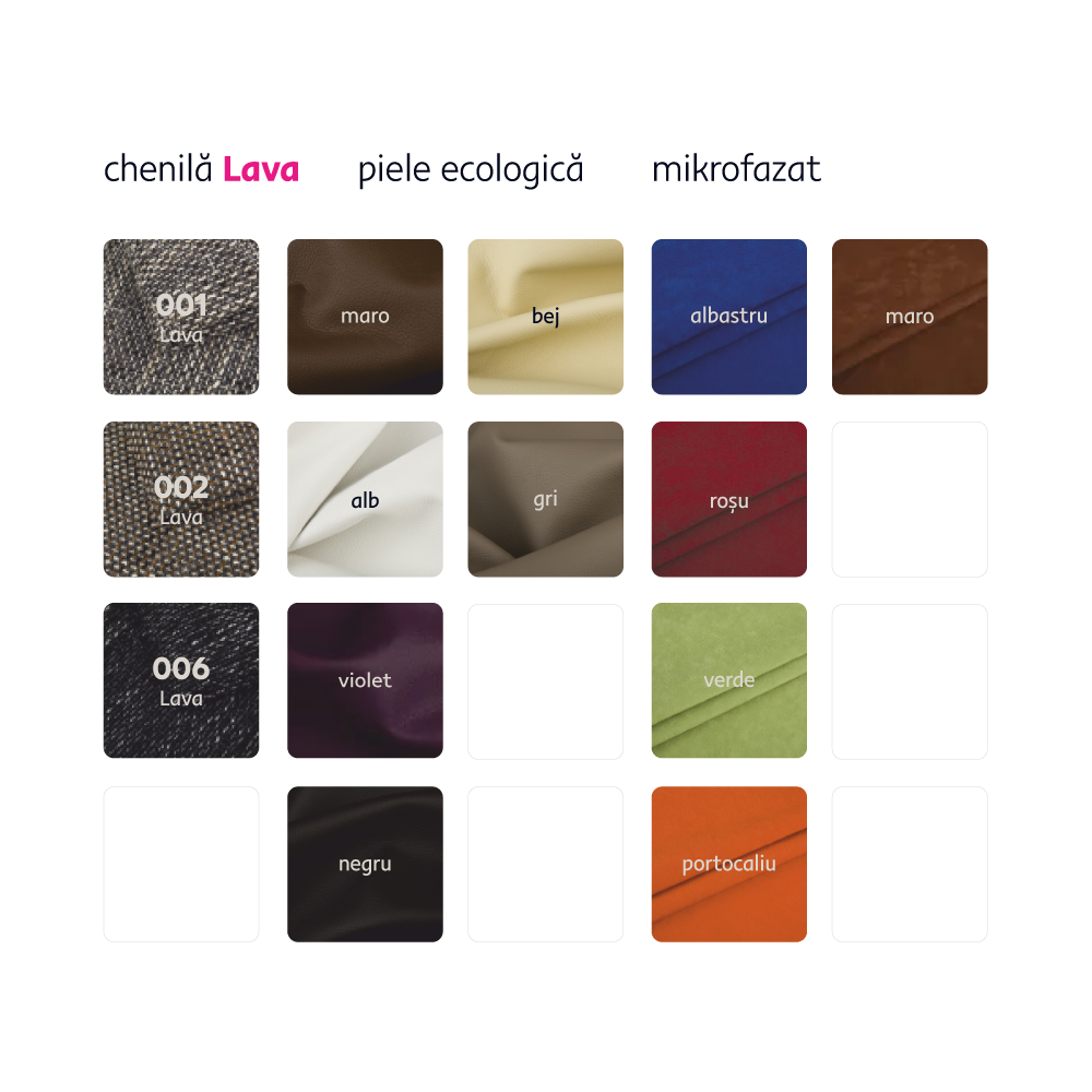 Posibilitatea de a cumpăra în materialul textil Soro, Kronos sau Savana la preţul de 746,-. în microfibră la preţul de 699,-., în piele ecologică la preţul de 766,-. Pentru o comandă individuală, este necesar să plătiţi un avans de 10% din sumă. După achitarea avansului, comanda dvs. va fi dată în producţie. Durata de livrare este între 6-8 săptămâni.