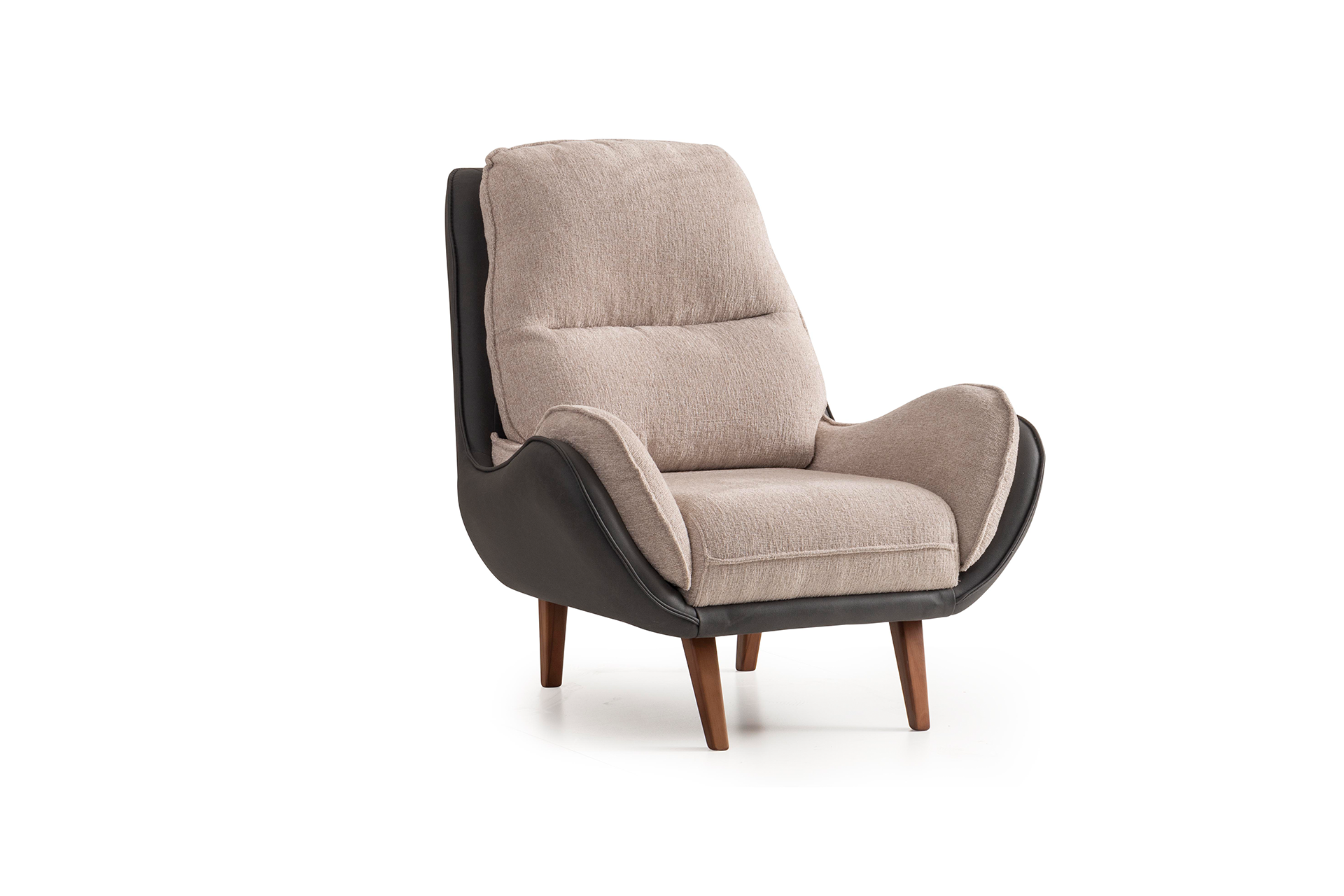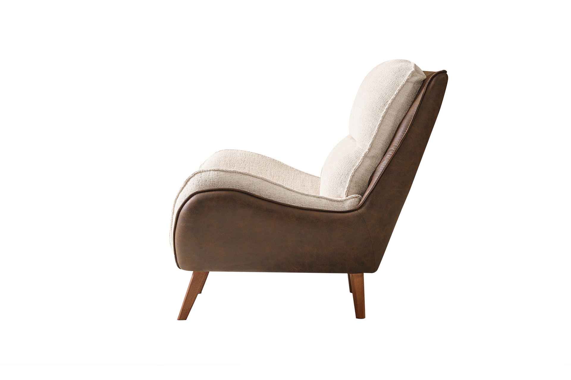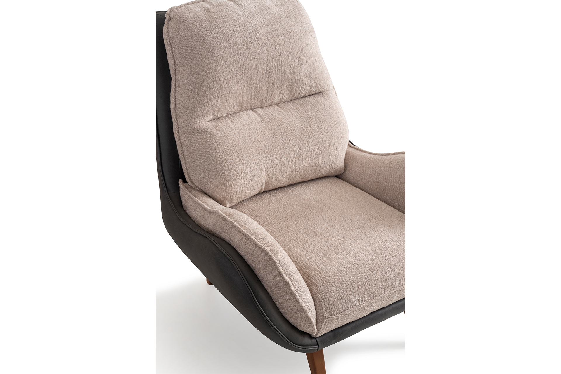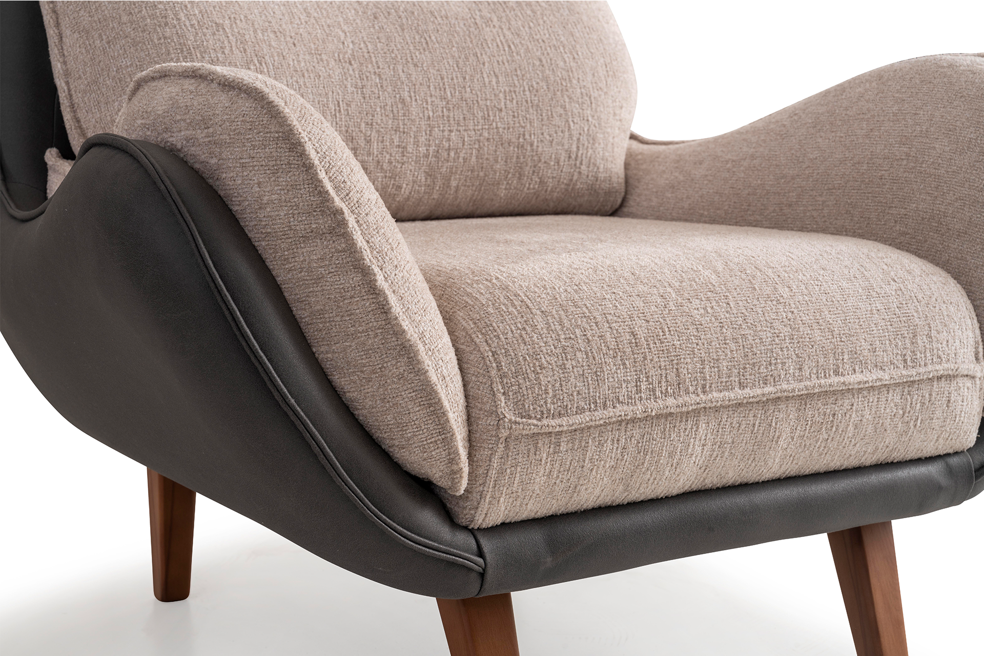 Tip: 1 loc. Materialul de acoperire: stofă boucle și stofă (similară cu pielea întoarsă); Finisaj: Ruya 03 + Keops 65 (crem + gri), Ruya 03 + Keops 54 (crem + maro); Dotări: picioare cu finisaj lemn; Dimensiuni: L85 x A85 x H90 cm (lungime x adâncime x înălțime).