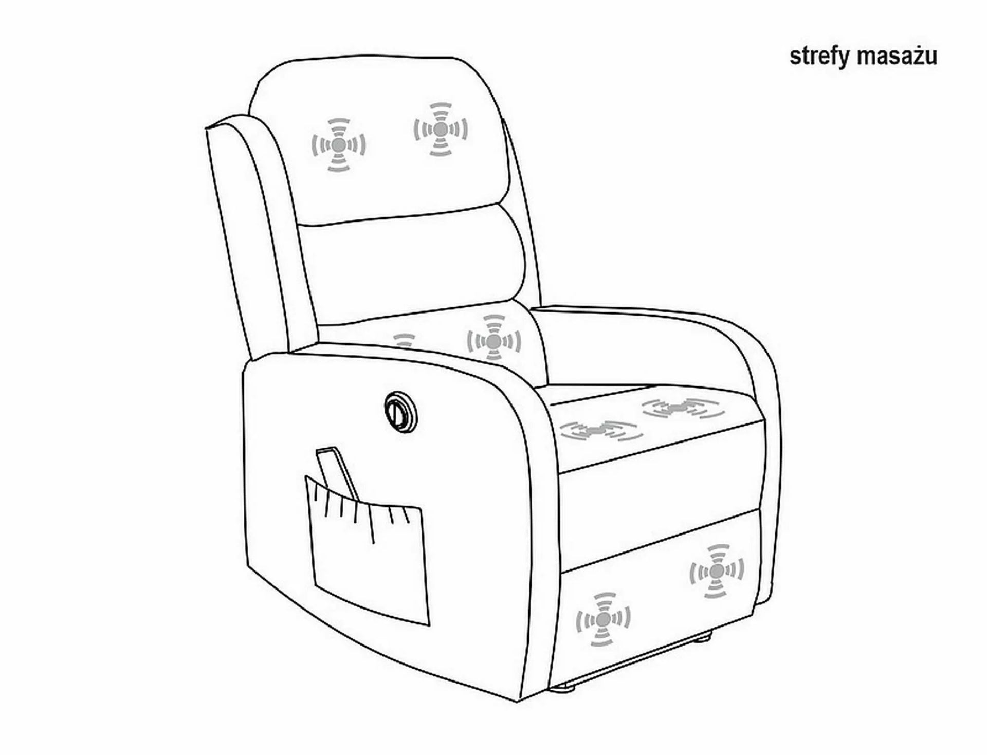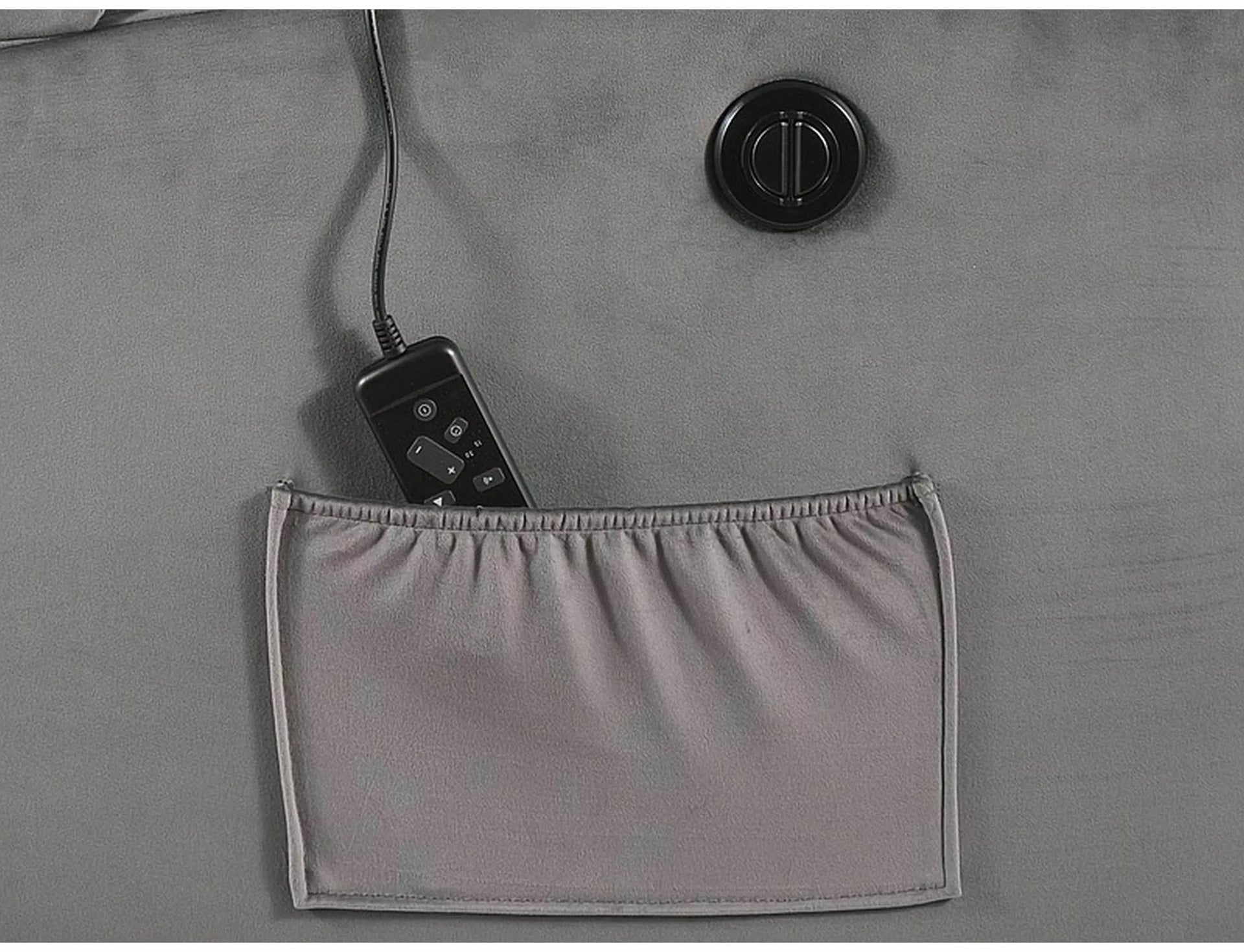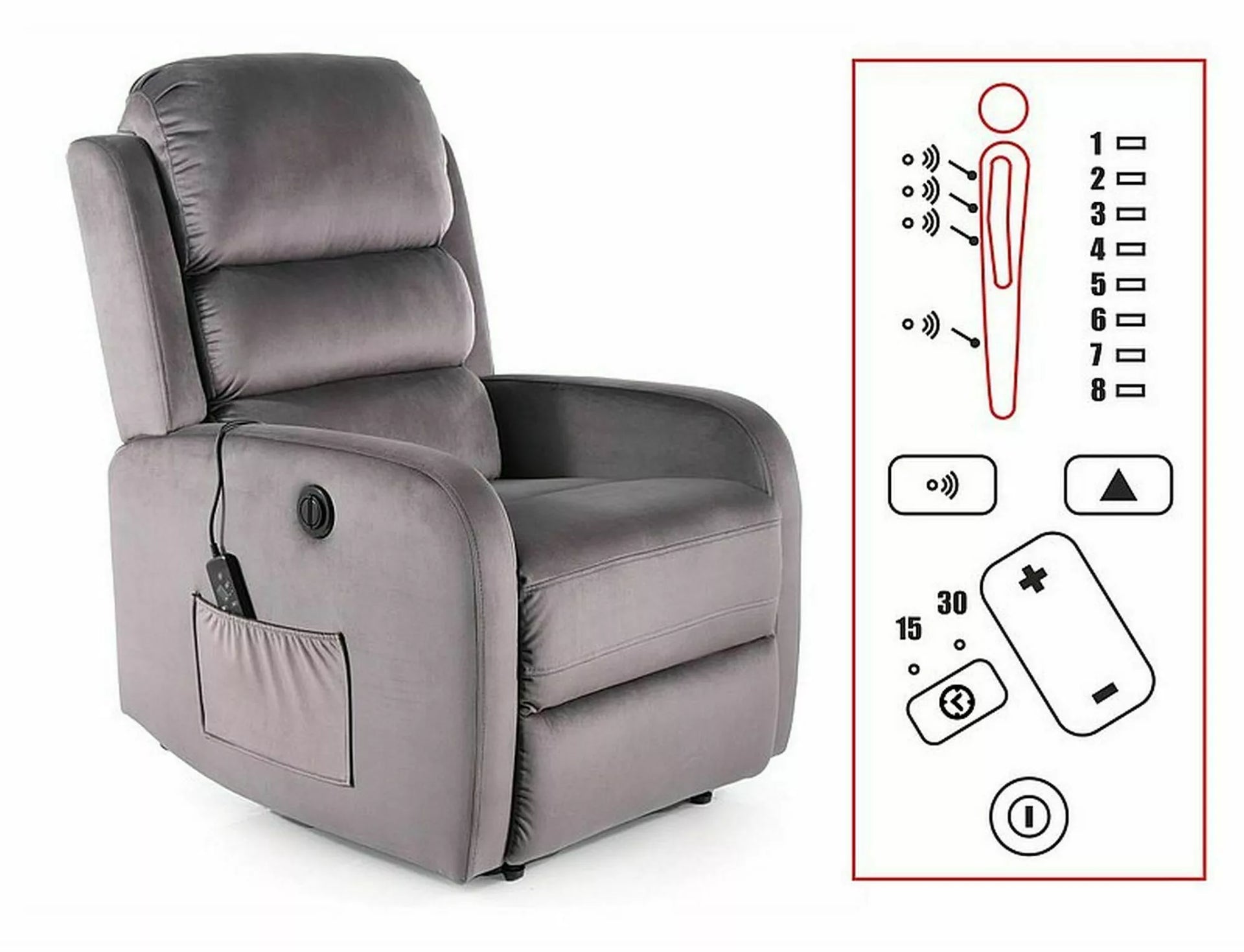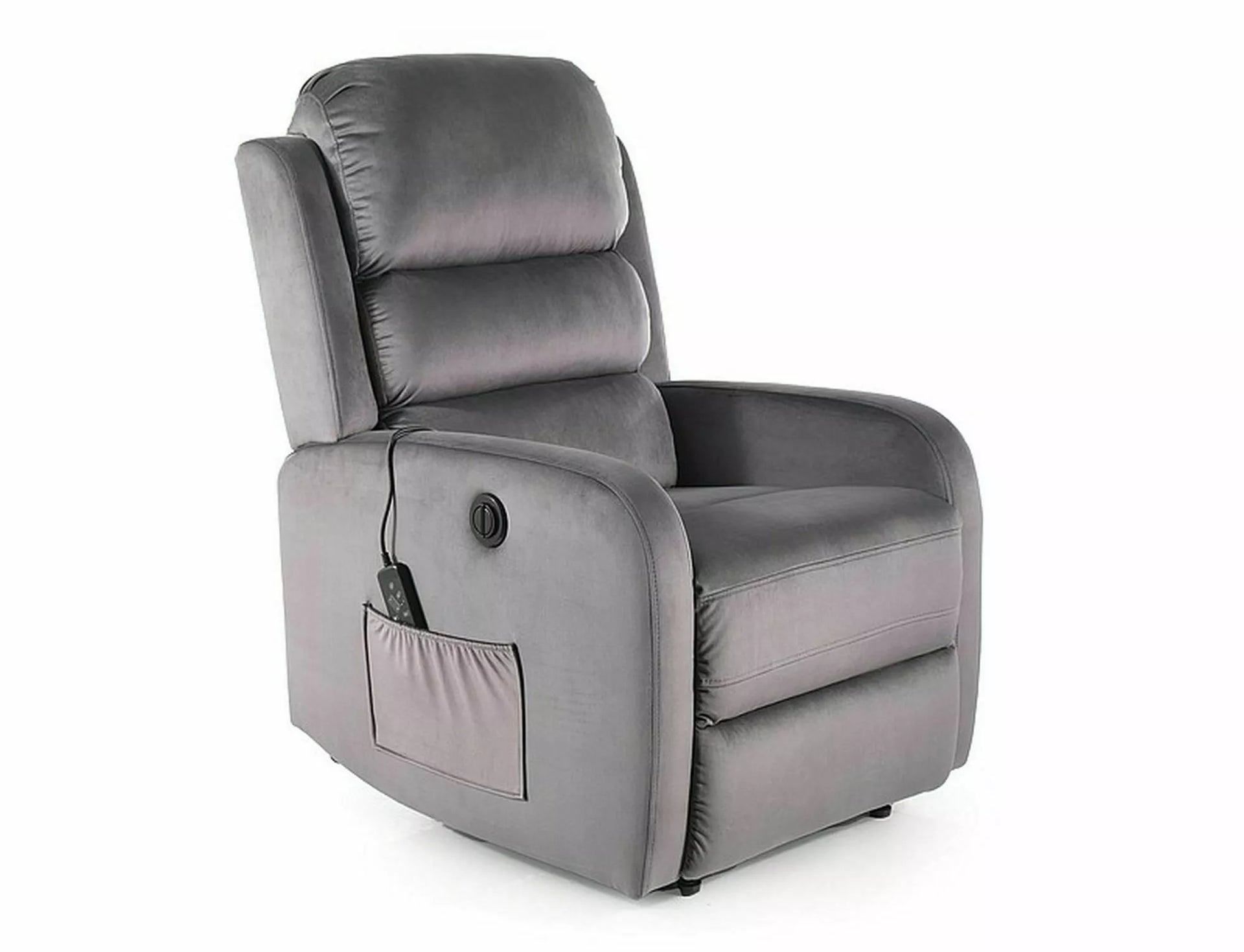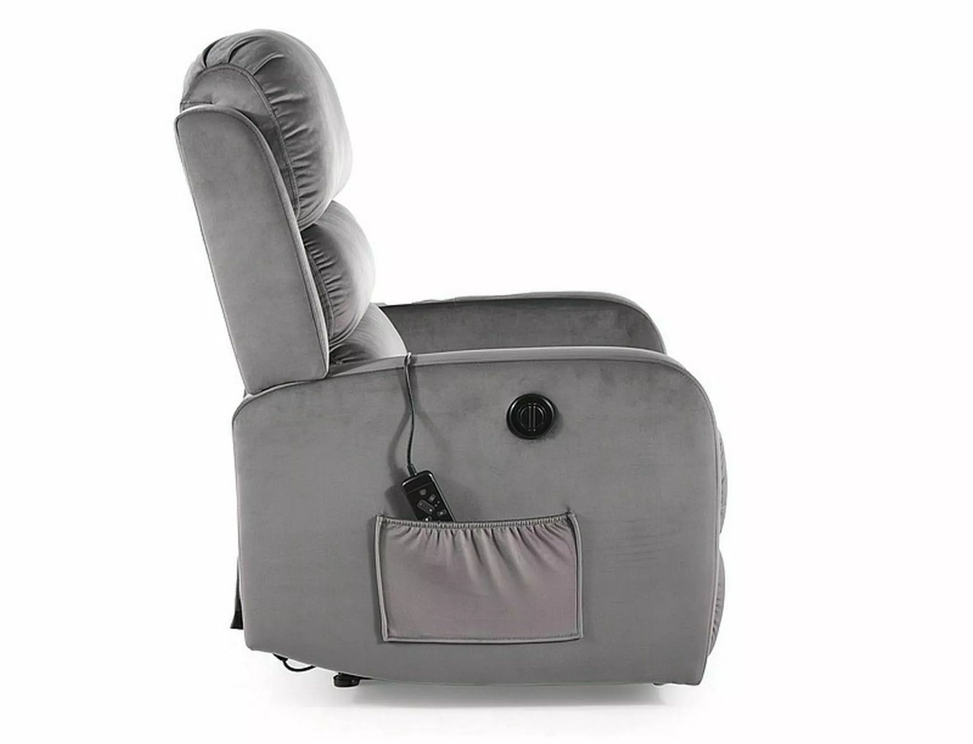 Fotliu înclinabil electric cu funcție de masaj, țesătură de catifea: Bluvel, culori: gri 14. Control înclinabil printr-un panou pe partea dreaptă a fotoliului. Funcții de masaj reglabile cu ajutorul unei telecomenzi cu fir, cu opțiuni: timp de funcționare, selectarea zonei și intensitatea masajului. Partea laterală a fotoliului are un buzunar practic.