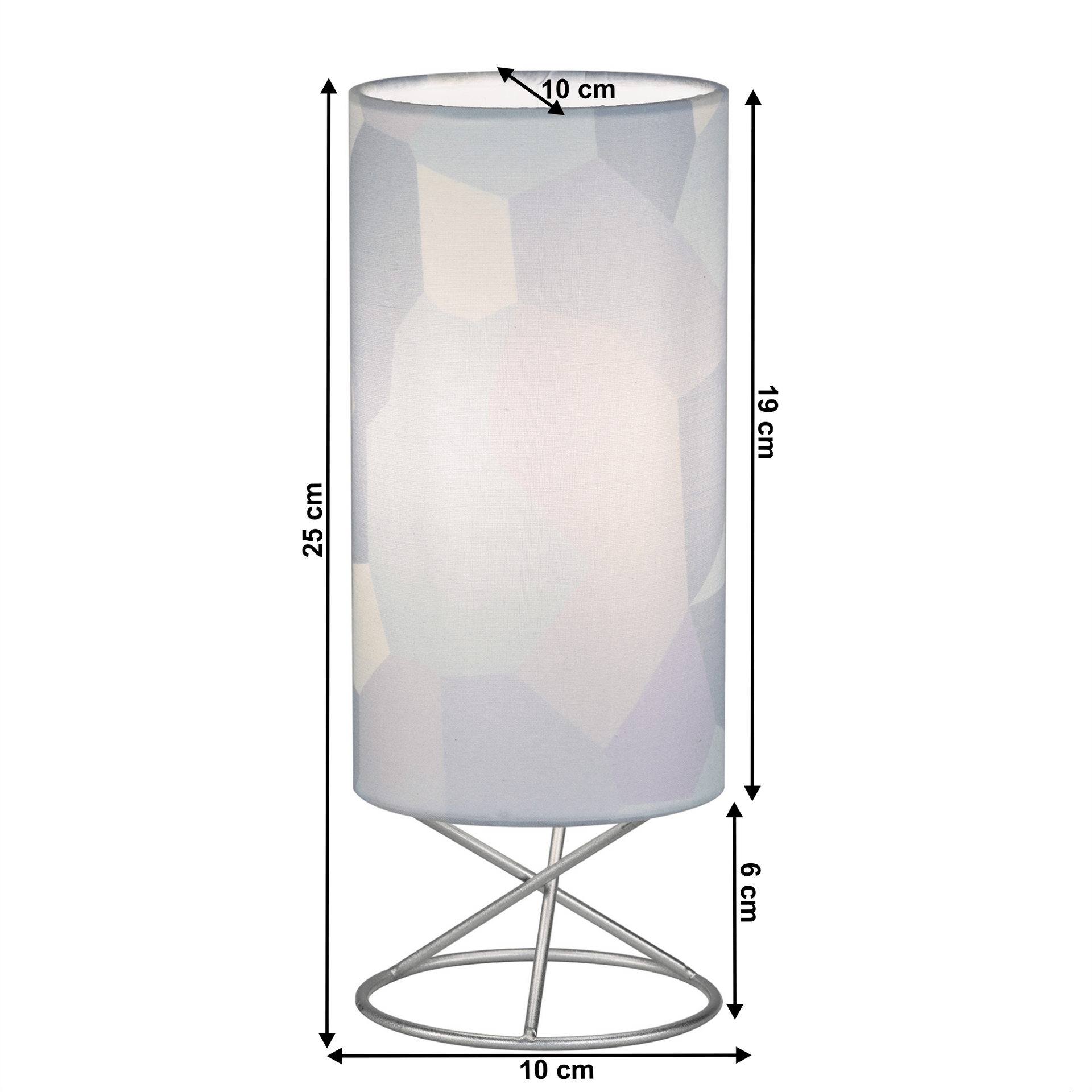 Lampă de masă AVAM Material: metal/ textil Culoare: gri/ model Dimensiuni totale (LxlxÎ): 10x10x25 cm Dimensiuni bază (LxlxÎ): 10x10x6 cm Dimensiuni abajur (LxlxÎ): 10x10x19 cm Se livrează fără bec Tip bec recomandat (filet): E14 Puterea maximă a lămpii: 40 W Lungime cablu: 1,3 m Greutate: 0,2 kg Design modern Livrată dezasamblată