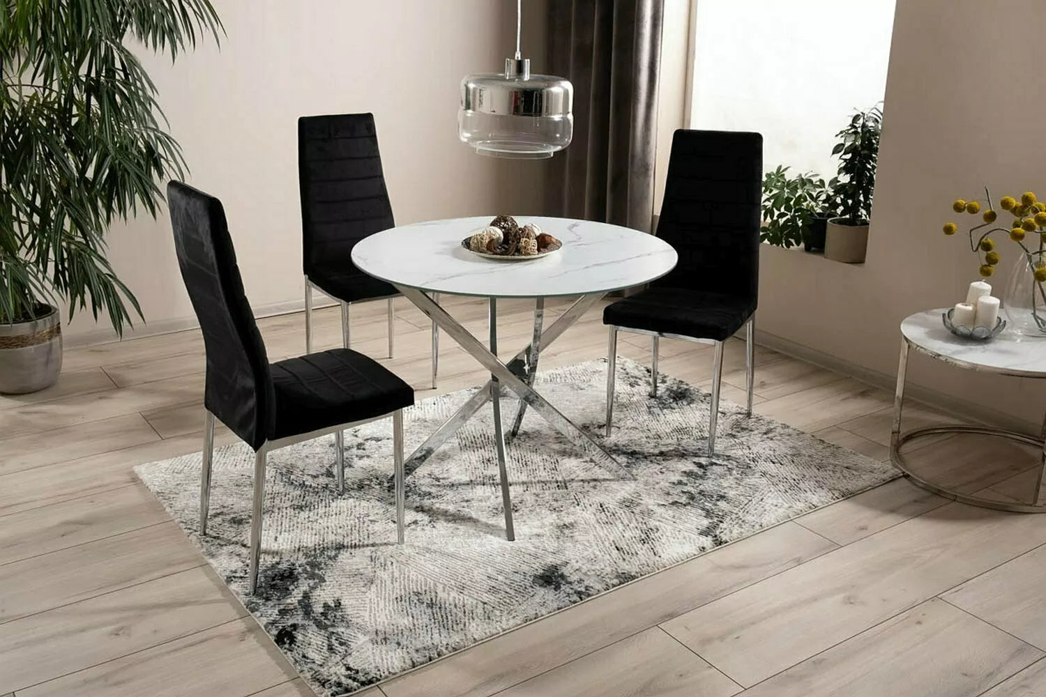 Masa, blat: sticla securizata, efect de marmura, cadru: metal, culoare: alb/crom.
