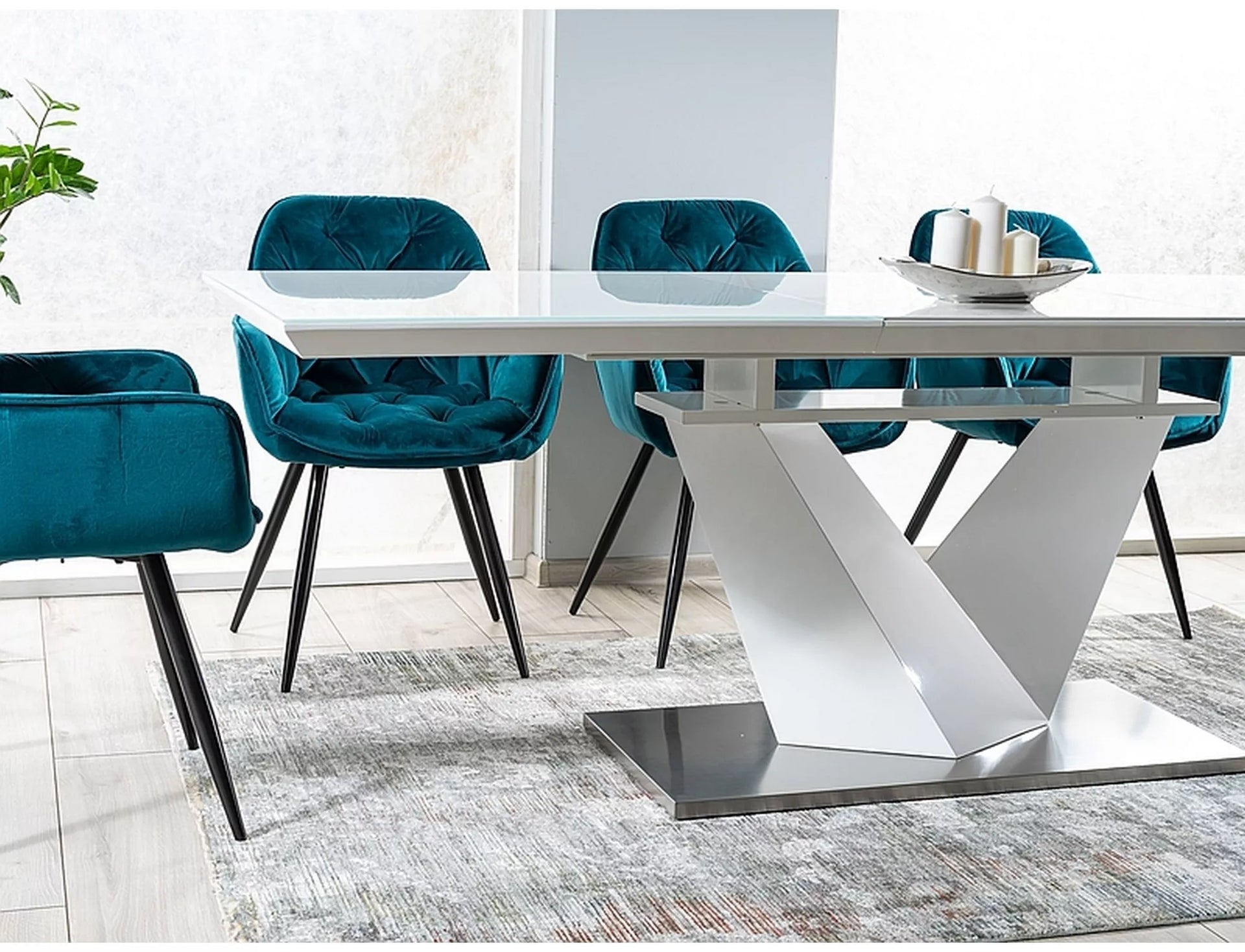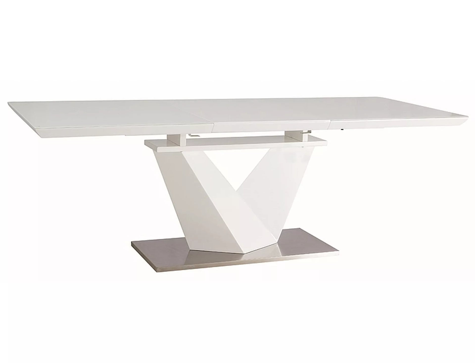 Masa extensibila, blat: sticla securizata + MDF, baza MDF + otel periat, culoare: lac alb + alb.