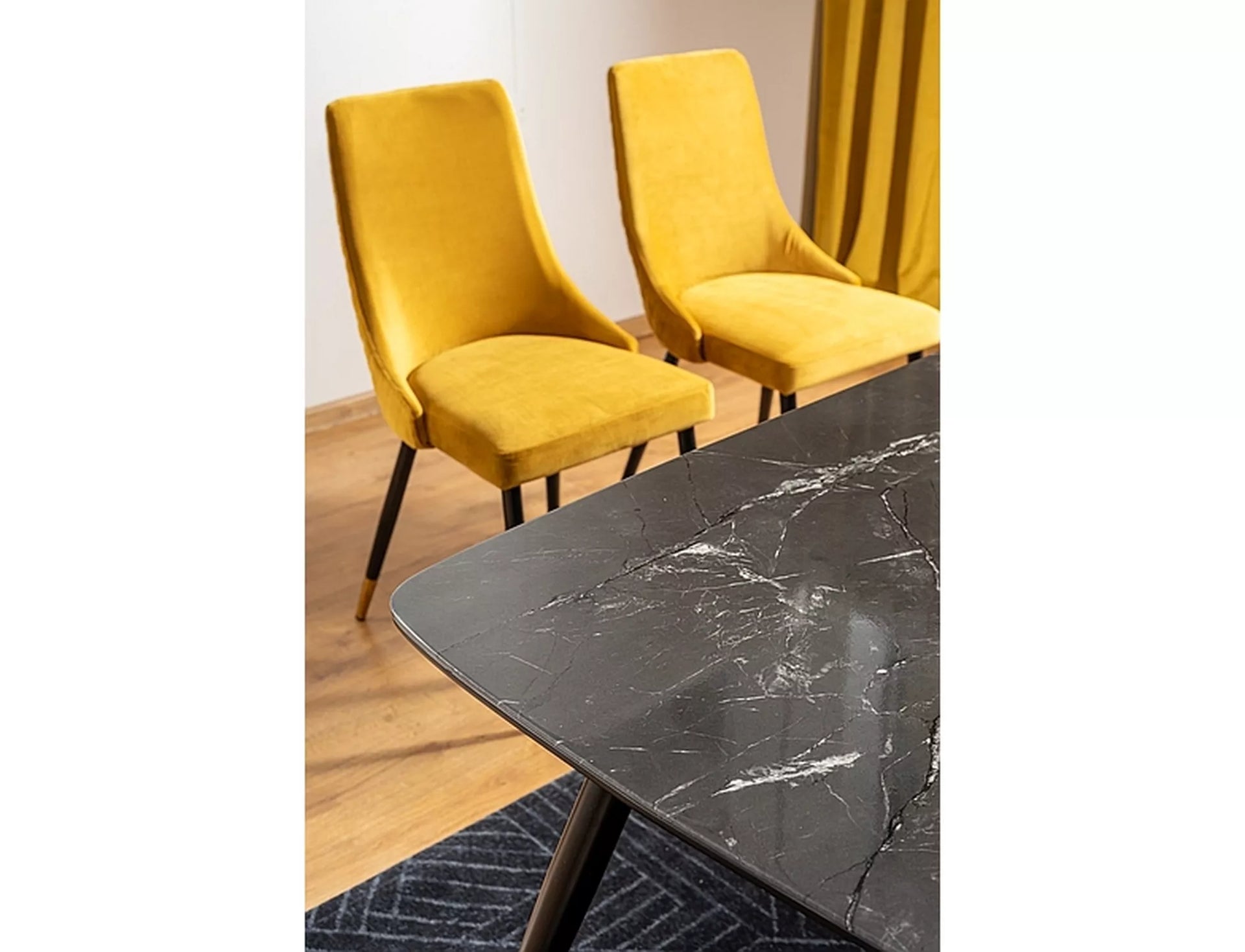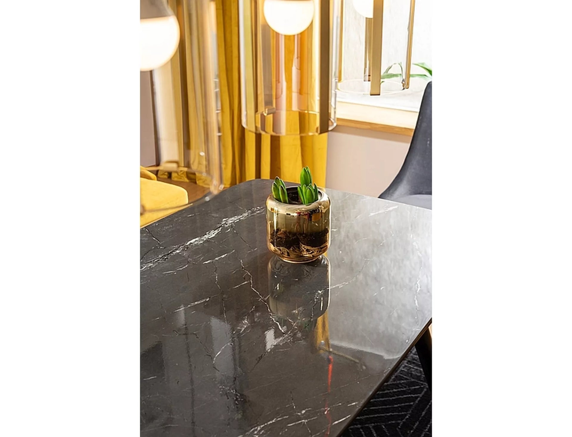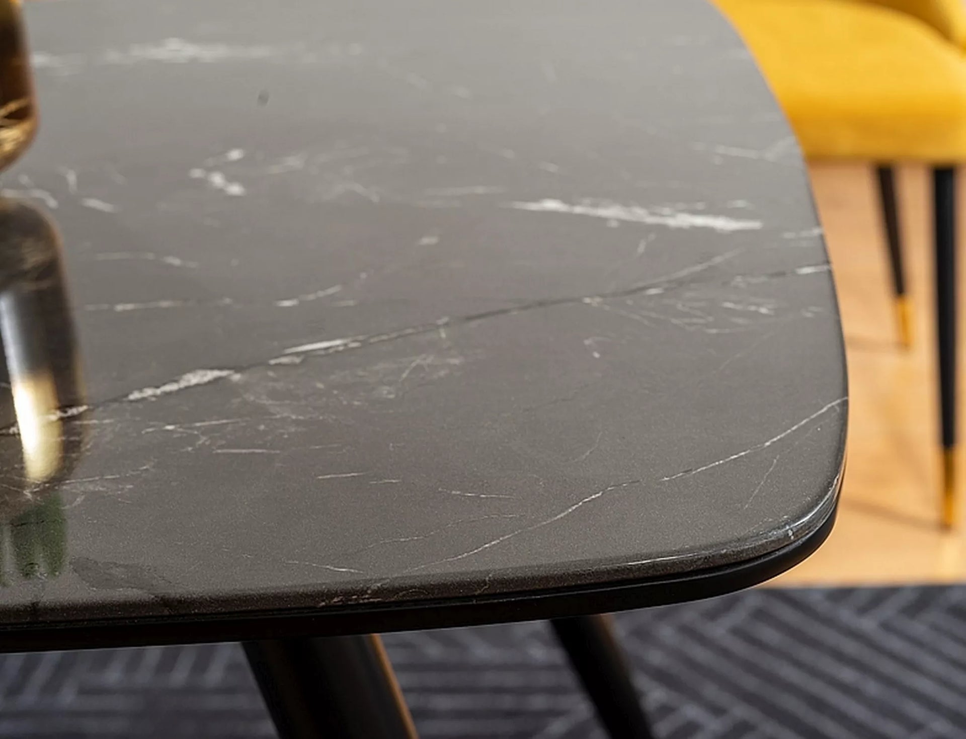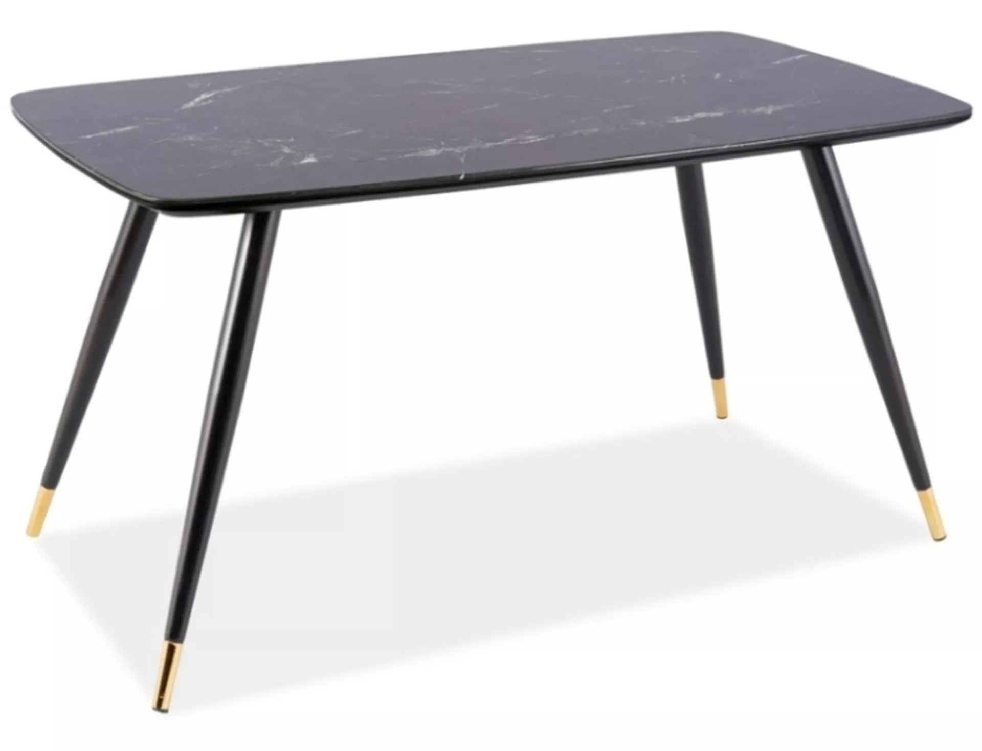 Masa, blat: MDF + sticla securizata, efect de piatra, cadru: metal, culoare: negru / negru + auriu.