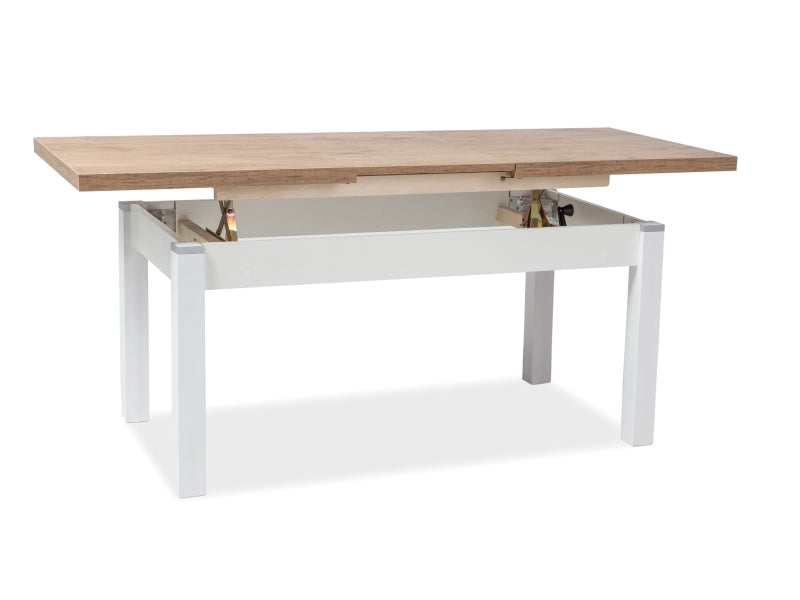 Masa, blat: placa laminata, cadru: lemn, culori: stejar lancelot + alb semimat. Reglarea usoara a ridicarii mesei, inaltime maxima 71 cm. Inserție suplimentară, lungimea mesei când este desfășurată 164 cm.