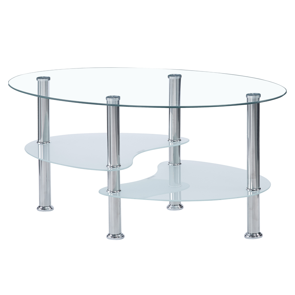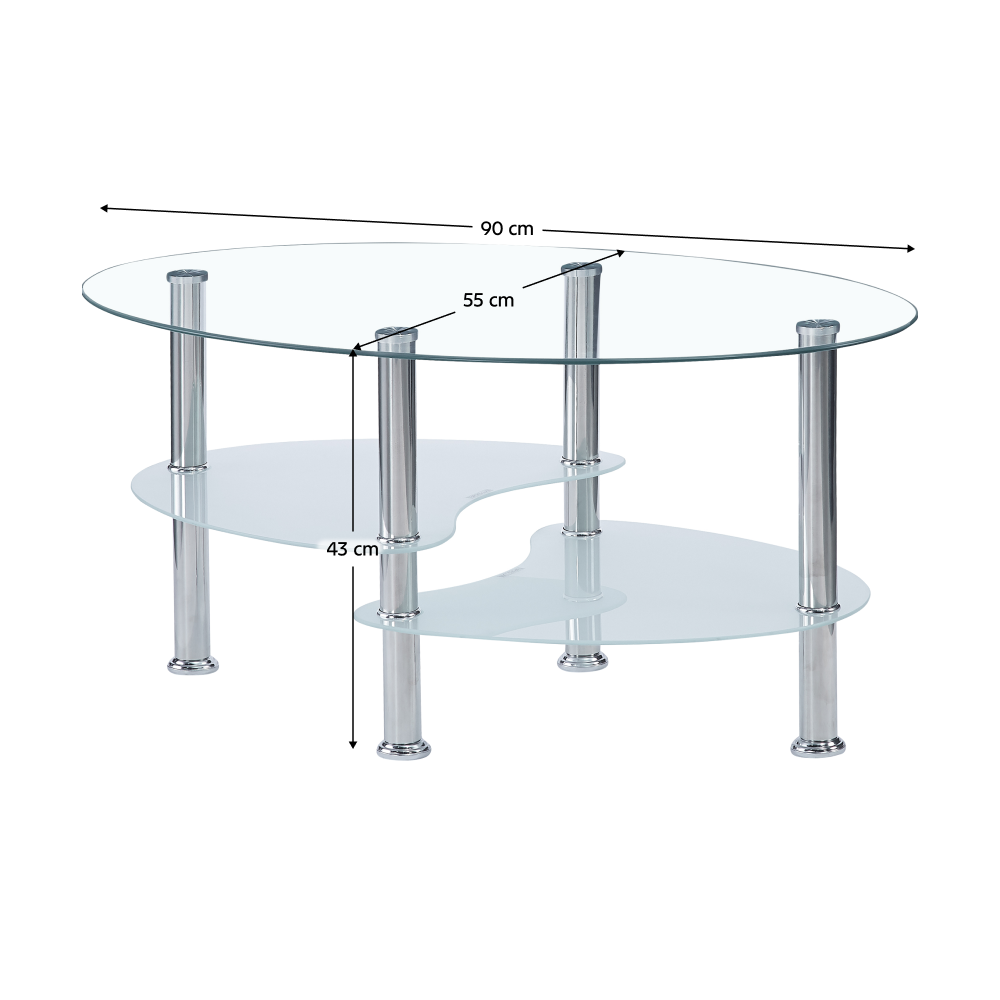 Măsuţă de cafea WAVE 2 NEW Material: sticlă călită/oţel inoxidabil Culoare: sticlă transparentă/sticlă mată/oţel Dimensiuni (Lxlxh): 90x55x43 cm 2 sticle mici mate Sticlă superioară transparentă Grosimea sticlei superioare: 6 mm Grosimea sticlei inferioare: 5 mm Livrat dezasamblat