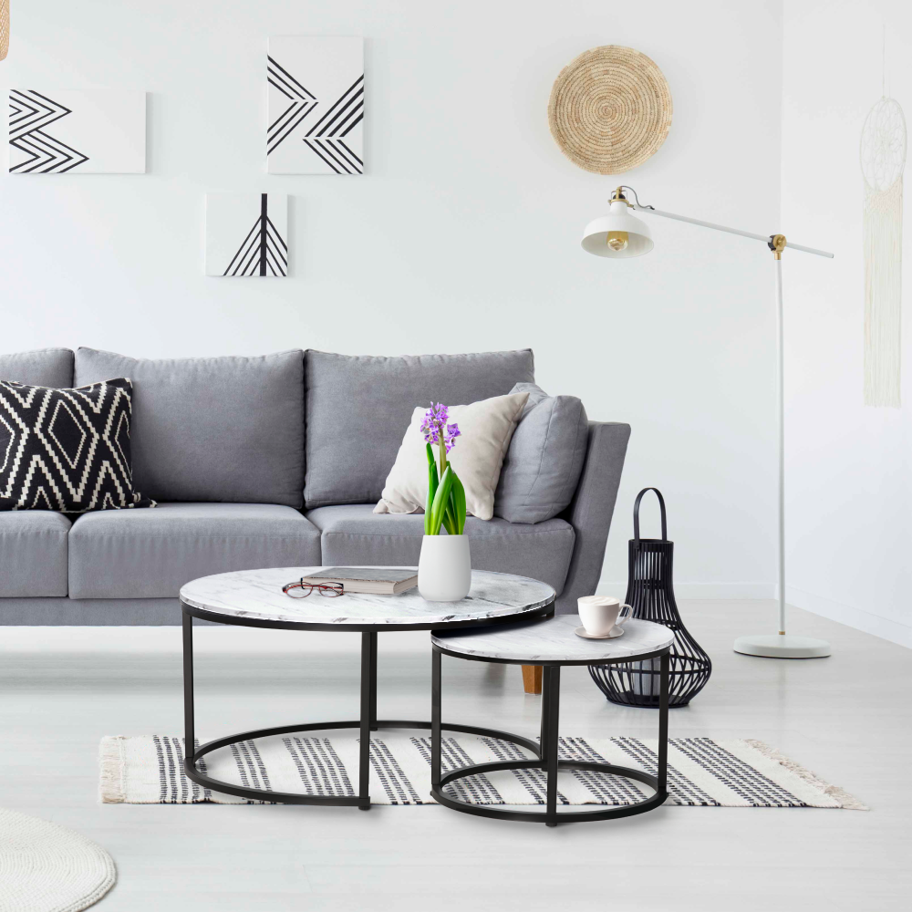 Material: DTD laminat/metal Culoare: negru/alb Masă mai mare (diametru x h): 80x48 cm Masă mai mică (diametru x h): 48x42 cm Grosime material: 1,5 cm Portanţă: 40 kg Set de două mese Posibilitate a împinge masa mai mică sub cea mai mare Rotund Modern Livrat dezasamblat