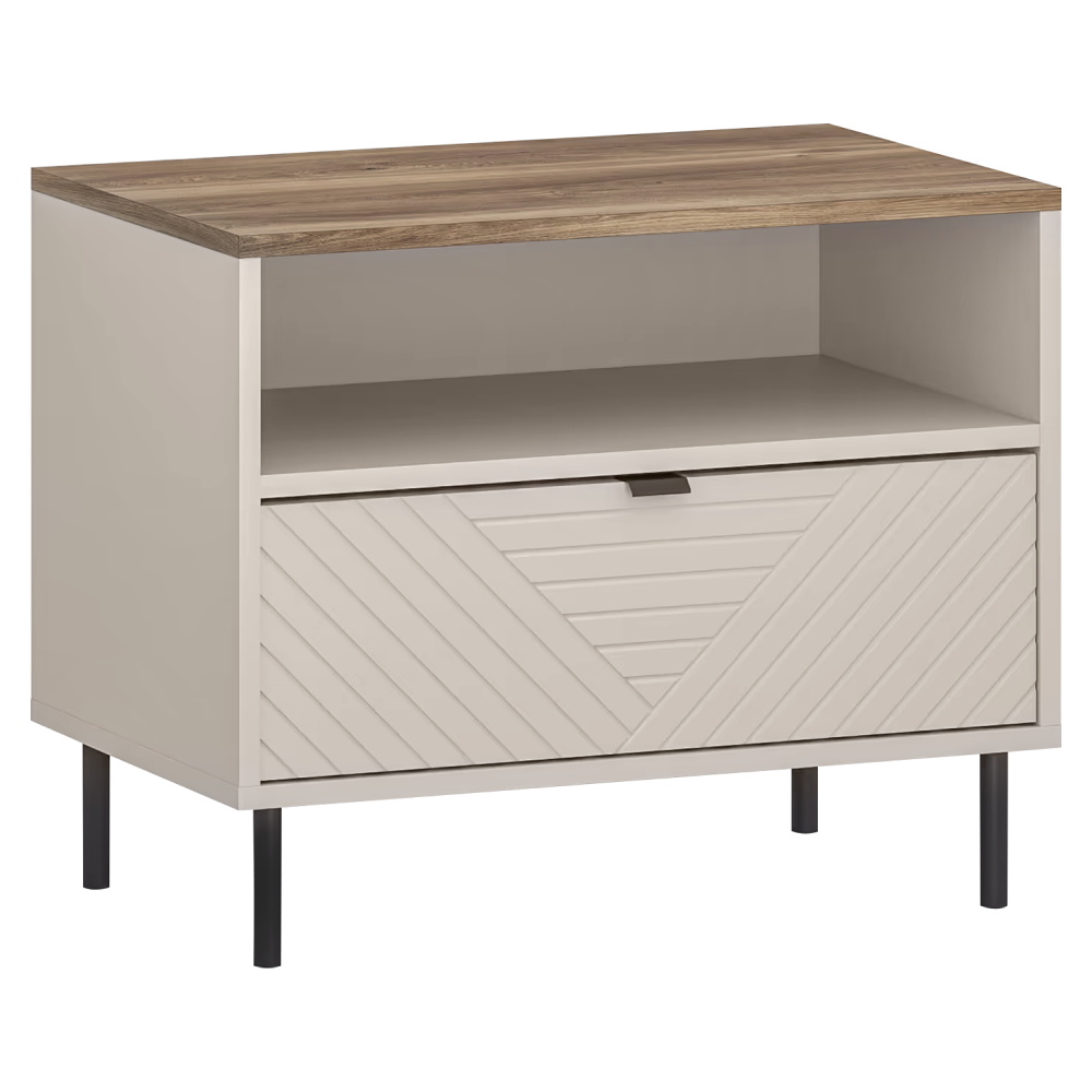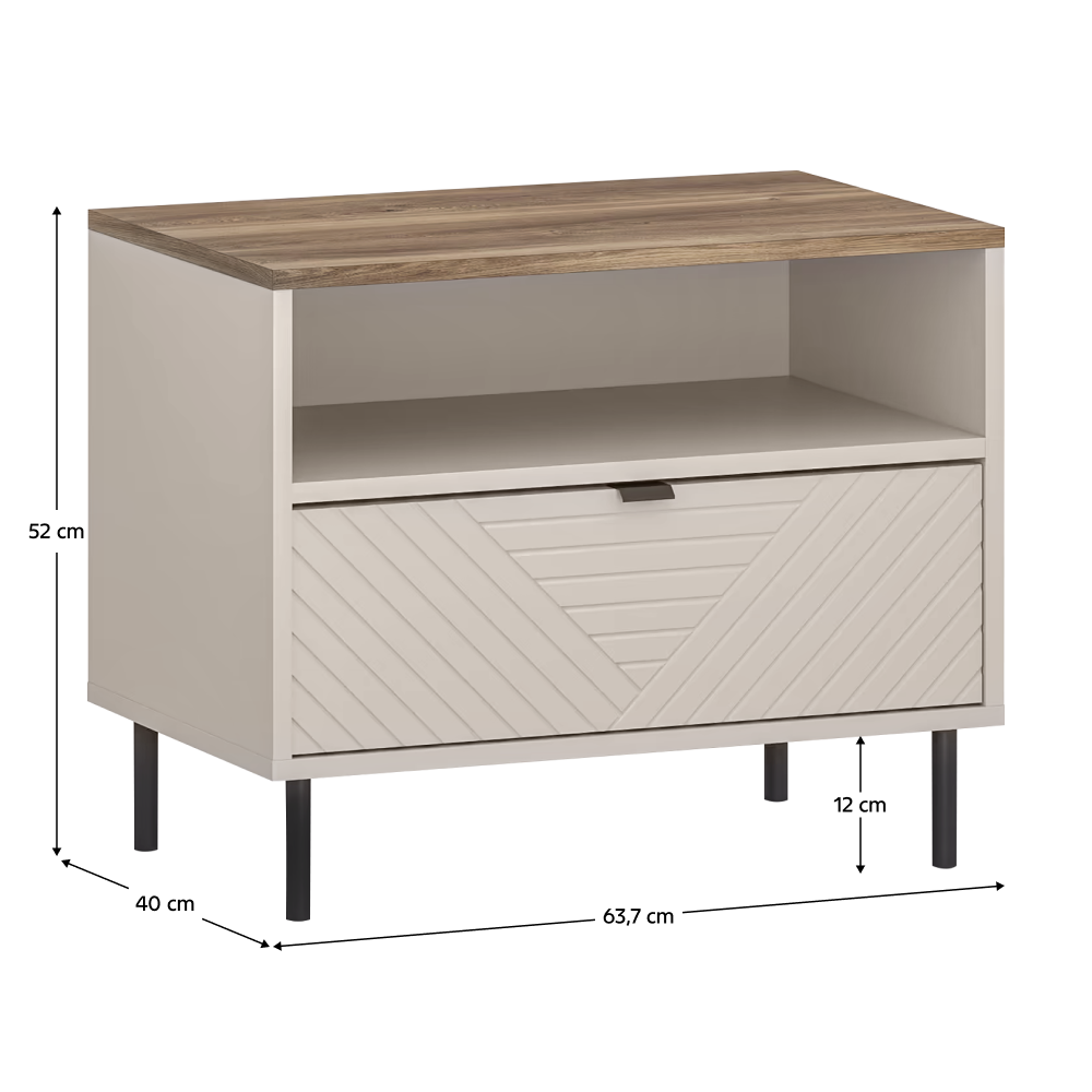 Material: DTD laminat/MDF înfoliat/margini ABS Culoare: caşmir/stejar castello Dimensiuni (lxAxh): 63,7x40x52 cm Grosime material: 1,6 cm Un sertar Spaţiu de depozitare deschis Poliţă Cu mânere Material mâner: metal Culoare mâner: negru Pe picioare Material picior: metal Culoare picior: negru Înălţime picior: 12 cm Portanţă placă superioară: 30 kg Portanţa poliţei şi a sertarului: 5 kg Uşi decorative Design modern Vă recomandăm fixarea mobilierului de perete Livrat dezasamblat