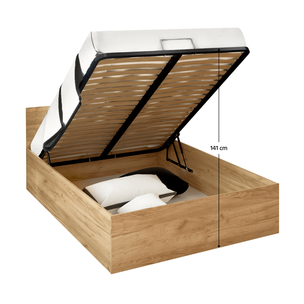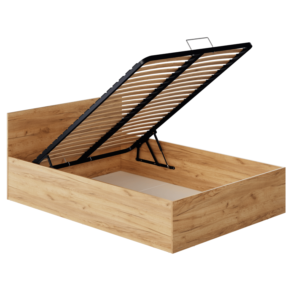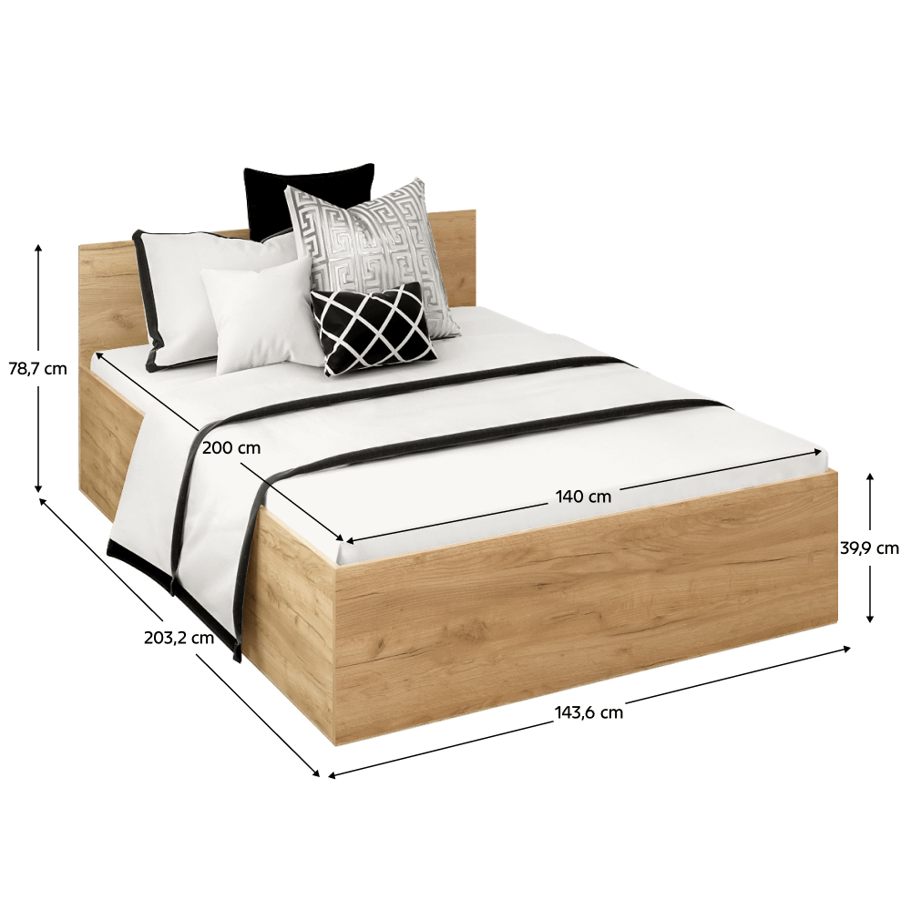 Material: DTD laminat Culoare: stejar craft auriu Dimensiuni (Lxlxh): 143,6x203,2x78,7 cm Dimensiuni zonă de dormit (Lxl): 140x200 cm Grosime DTD laminat: 1,6 cm Înălţimea până la grătar: 24,1 cm Înălţimea lateralei: 39,9 cm Înălţimea minimă recomandată a saltelei: 10 cm Single Cu spaţiu de depozitare Înălţimea patului deschis: 141 cm Portanţă pe persoană: 90 kg Livrat cu grătar metalic Livrat fără saltea Opţiune de a cumpăra o saltea din oferta noastră Design modern Produs slovac de calitate Livrat dezasamblat