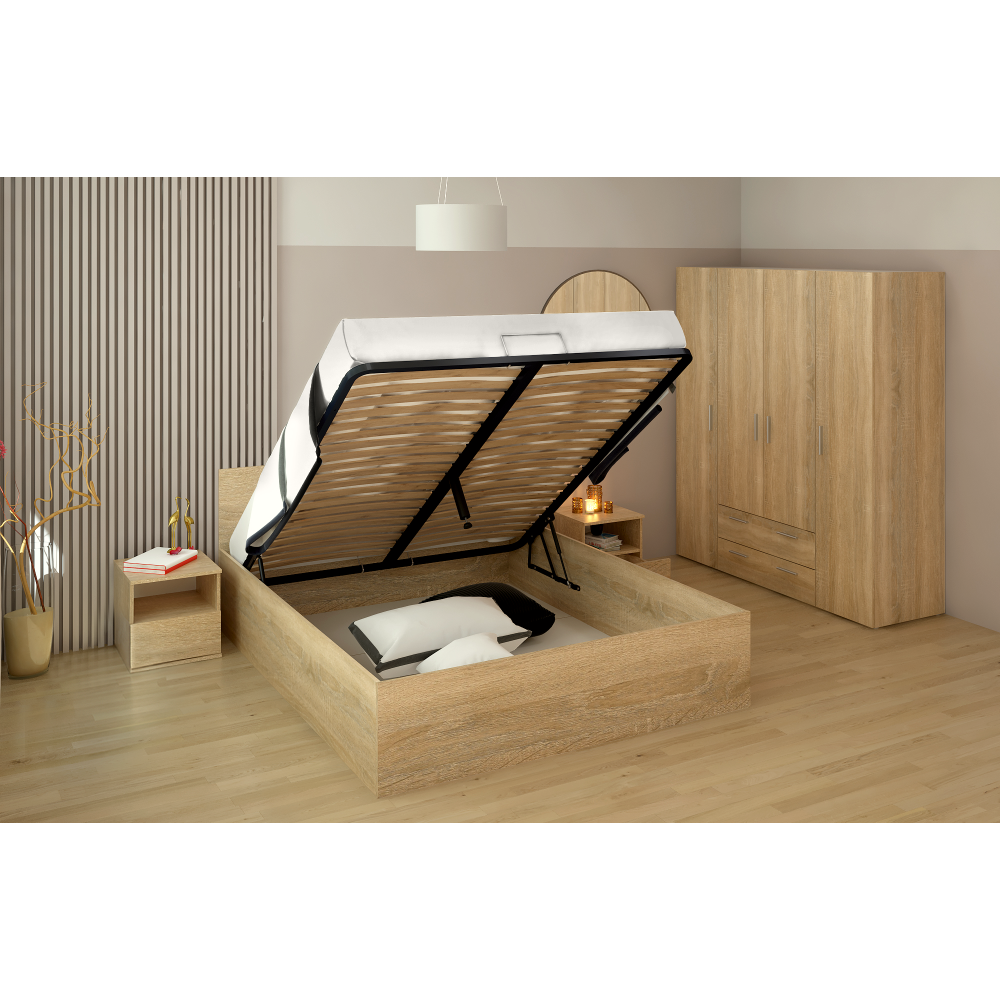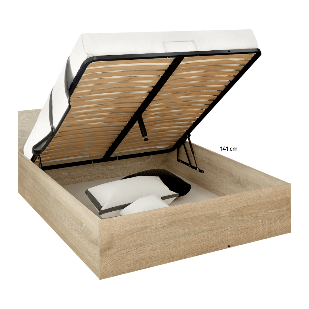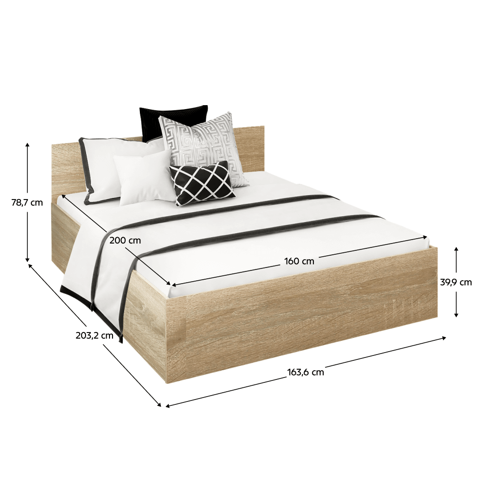 Material: DTD laminat Culoare: stejar sonoma Dimensiuni (Lxlxh): 163,6x203,2x78,7 cm Dimensiuni zonă de dormit (Lxl): 160x200 cm Grosime DTD laminat: 1,6 cm Înălţimea până la grătar: 24,1 cm Înălţimea lateralei: 39,9 cm Înălţimea minimă recomandată a saltelei: 10 cm Cu spaţiu de depozitare Înălţimea patului deschis: 141 cm Portanţă pe persoană: 90 kg Livrat cu grătar metalic Livrat fără saltea Opţiune de a cumpăra o saltea din oferta noastră Design modern Produs slovac de calitate Livrat dezasamblat