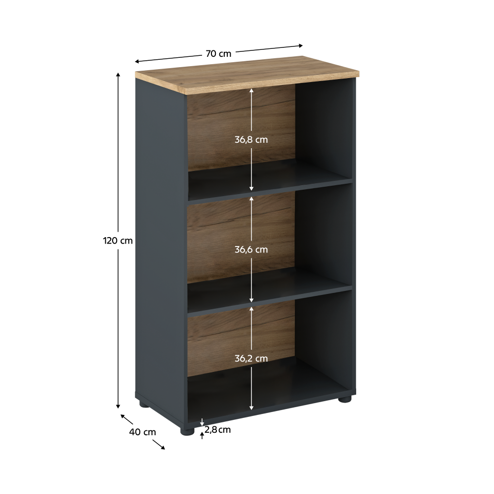 Material: Laminat HDF Culoare: stejar artisan Dimensiuni (Lxlxh): 70x40x120 cm Grosime material: 1,6-2,2 cm Spaţiu de depozitare deschis Două poliţe Portanţa raftului: 5 kg Pe picioare Picioare cu înălţime reglabilă Material picioare: metal Culoarea picioarelor: grafit Înălţimea picioarelor: 2,8-4,3 cm Produs slovac de calitate Livrat dezasamblat
