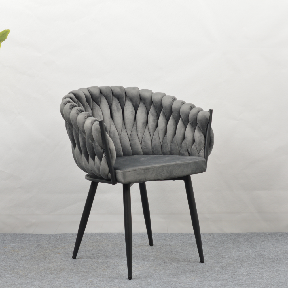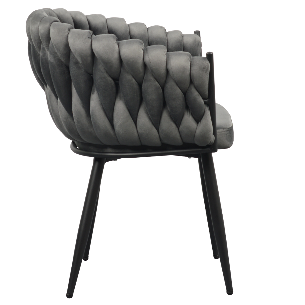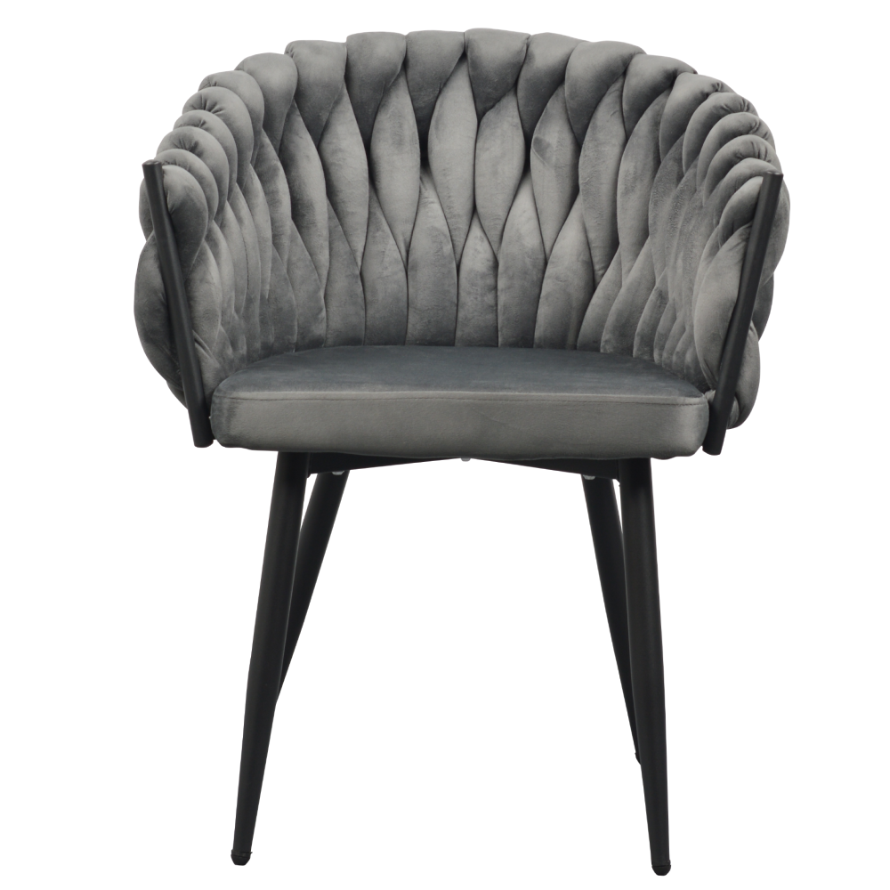 Material: ţesătură Velvet metal Rezistenţa ţesăturii la frecare conform testului Martindale: 80 000 de cicluri de frecare Culoare: gri închis / albă Dimensiuni (lxAxh): 64x55x78 cm Înălţimea părţii de şezut: 48 cm Adâncimea părţii de şezut: 41 cm Lăţime scaun: 46 cm Lăţime spătar: 43 cm Înălţime spătar: 33 cm Portanţă: 100 kg Cadru metalic De design Cusături decorative cu aspect deosebit Livrat dezasamblat