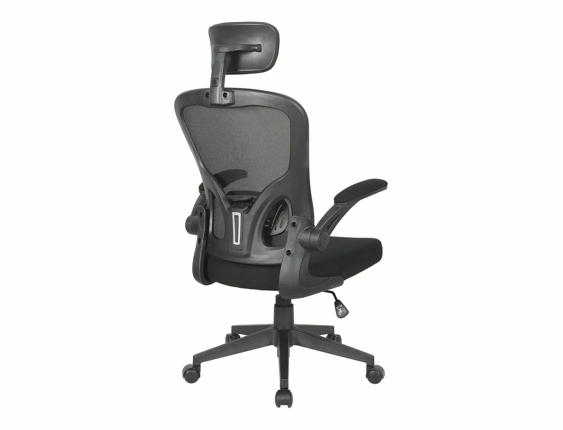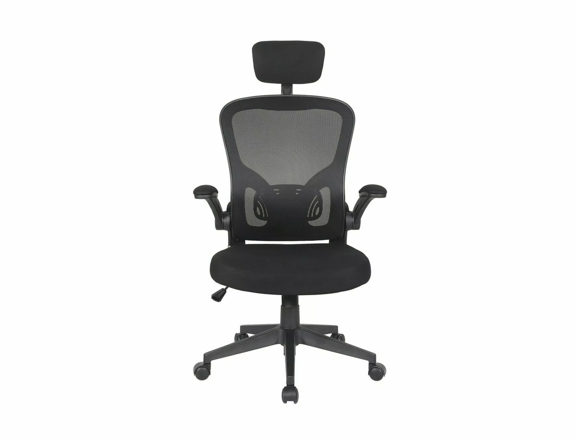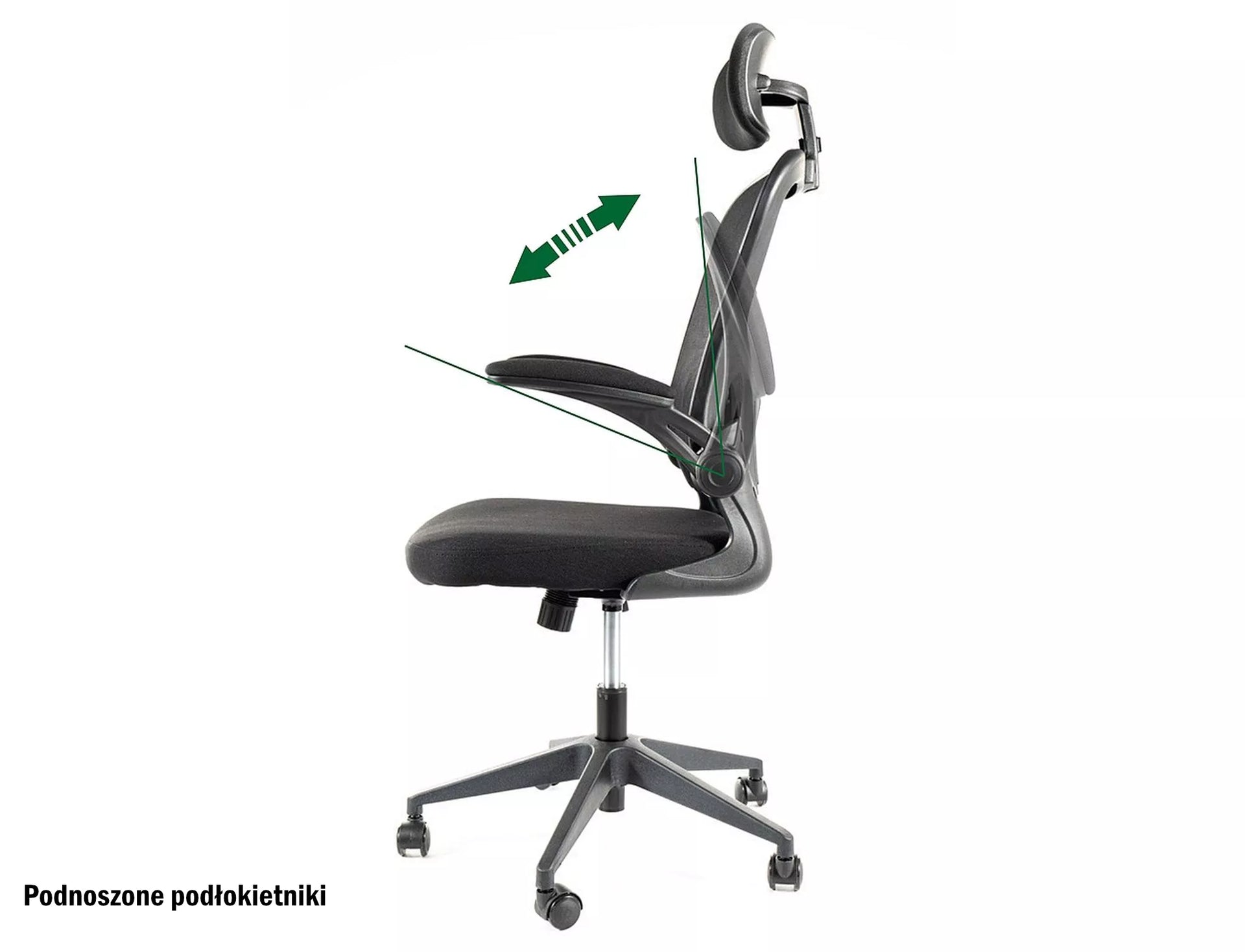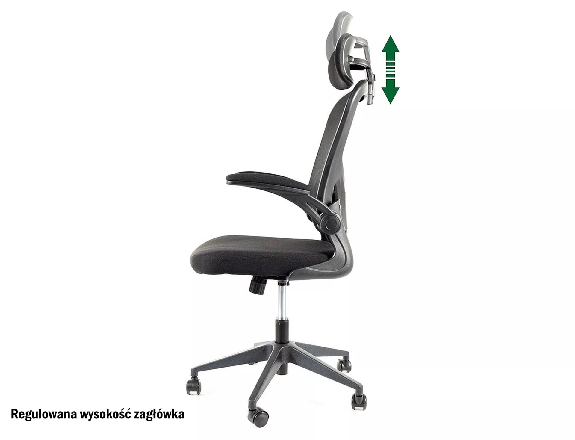 Fotoliu pivotant, material/plasă, culoare: negru, cadru, culoare: negru, mecanism TILT, roți din nailon, cotiere mobile, tetiera reglabilă și suport lombar, sarcină maximă 120 kg.