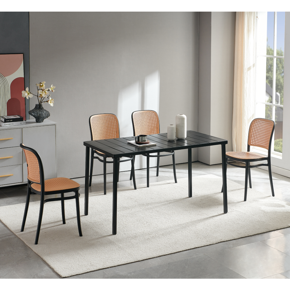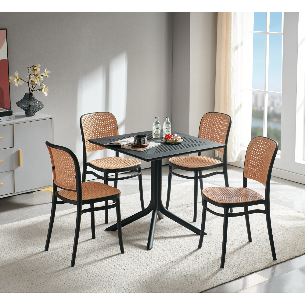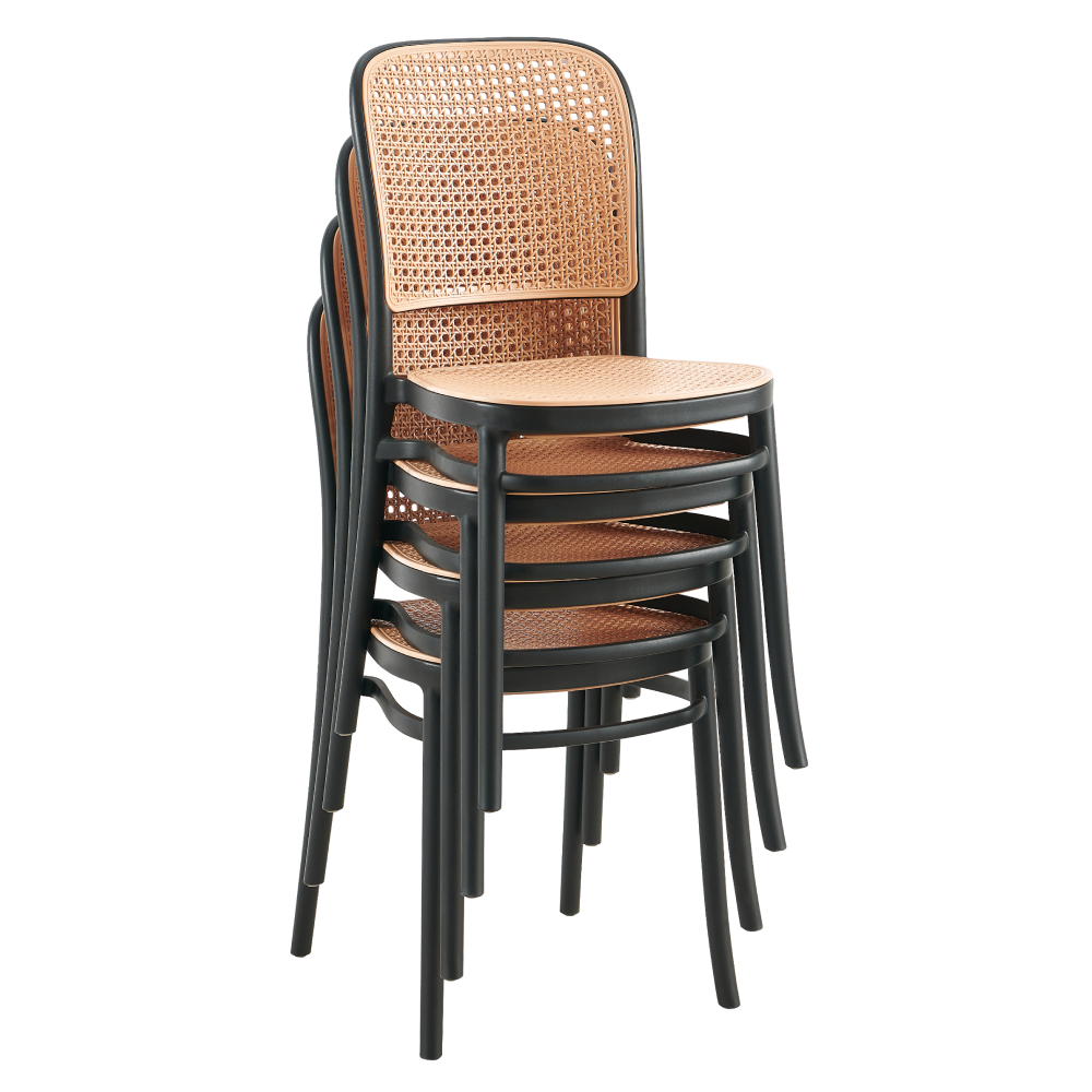 Material: plastic Culoare: neagră / bej Dimensiuni (LxAxÎ): 43,5x54x84 cm Înălţimea scaunului: 45,5 cm Adâncime scaun: 41 cm Lăţime scaun: 40 cm Înălţime spătar: 41,5 cm Lăţime spătar: 39 cm Capacitate de încărcare: 100 kg Greutate: 4,72 kg Stivuibil Potrivit pentru interior şi exterior Livrat asamblat