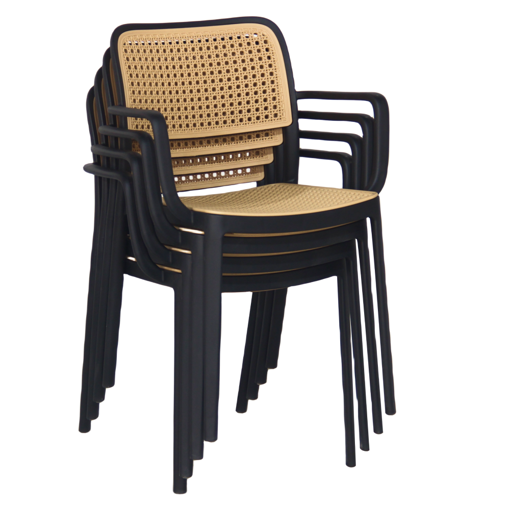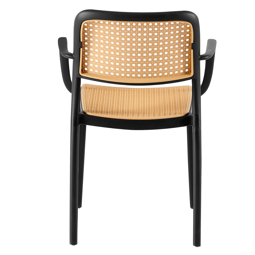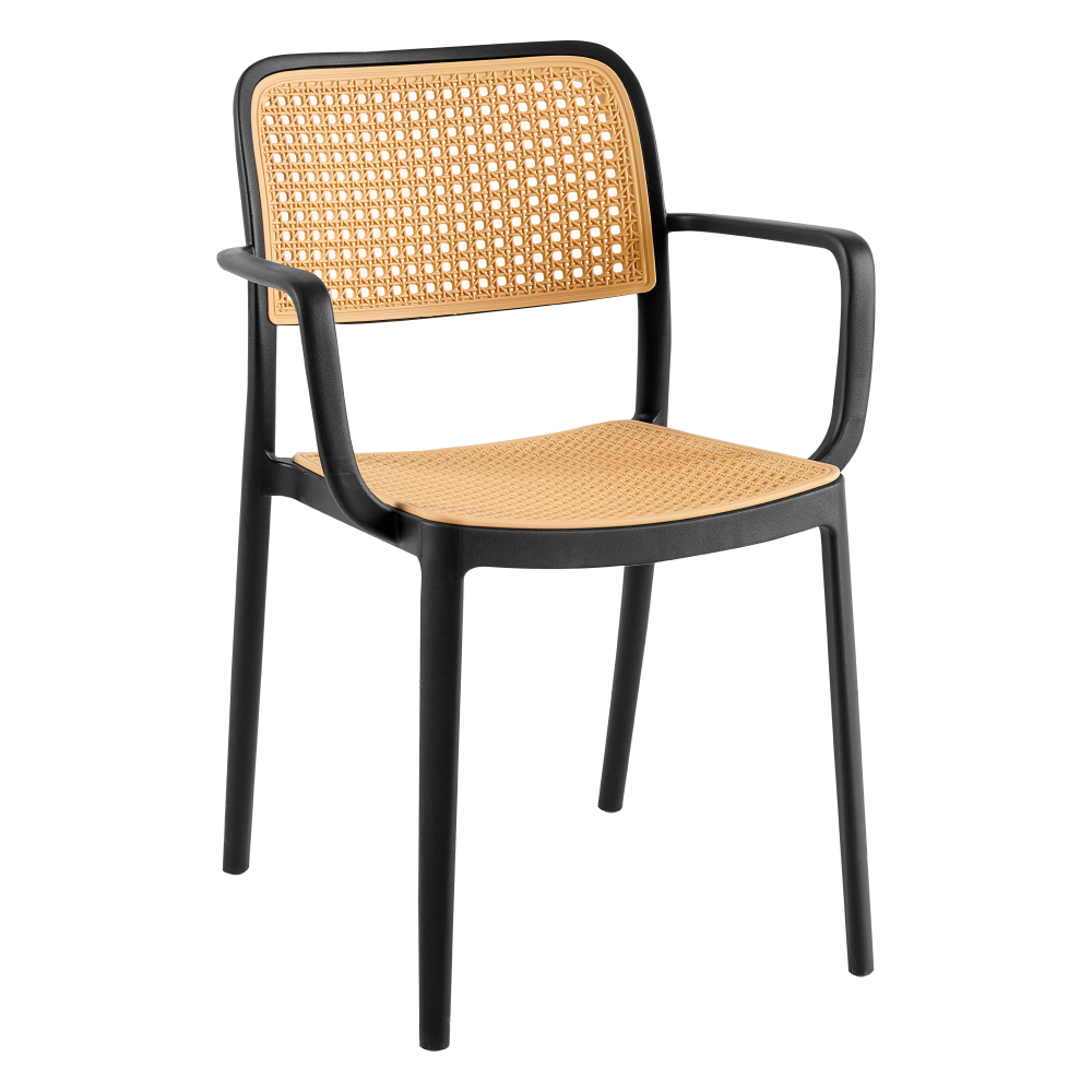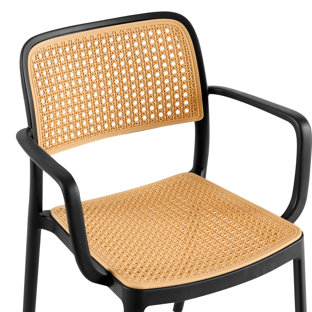 Material: plastic Culoare: neagră / bej Dimensiuni (LxAxÎ): 58x55x81,5 cm Înălţimea scaunului: 46 cm Adâncime scaun: 43 cm Lăţime scaun: 43 cm Înălţime spătar: 39 cm Lăţime spătar: 43 cm Capacitate de încărcare: 100 kg Greutate: 5,25 kg Stivuibil Potrivit pentru interior şi exterior Livrat asamblat