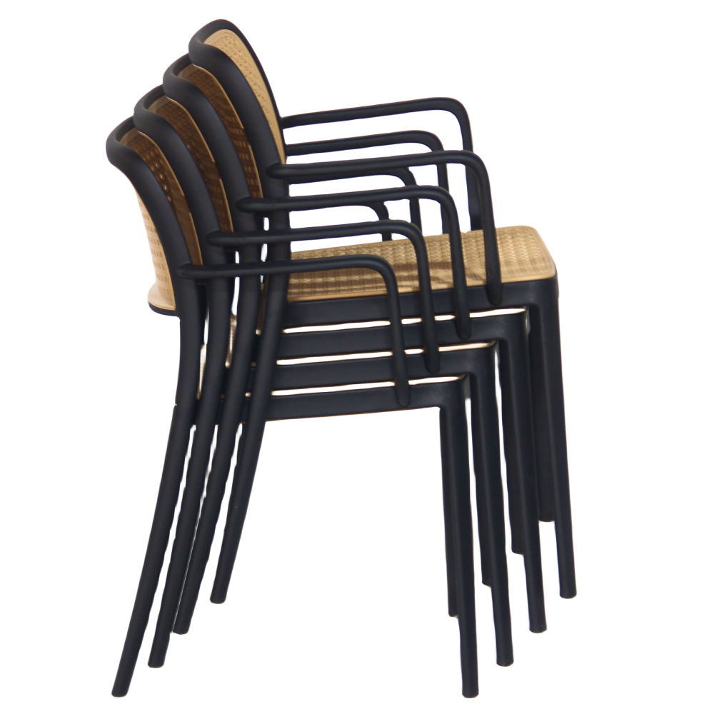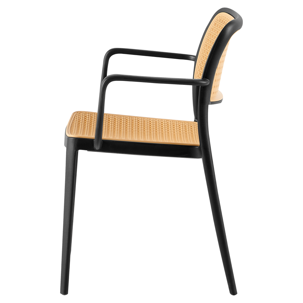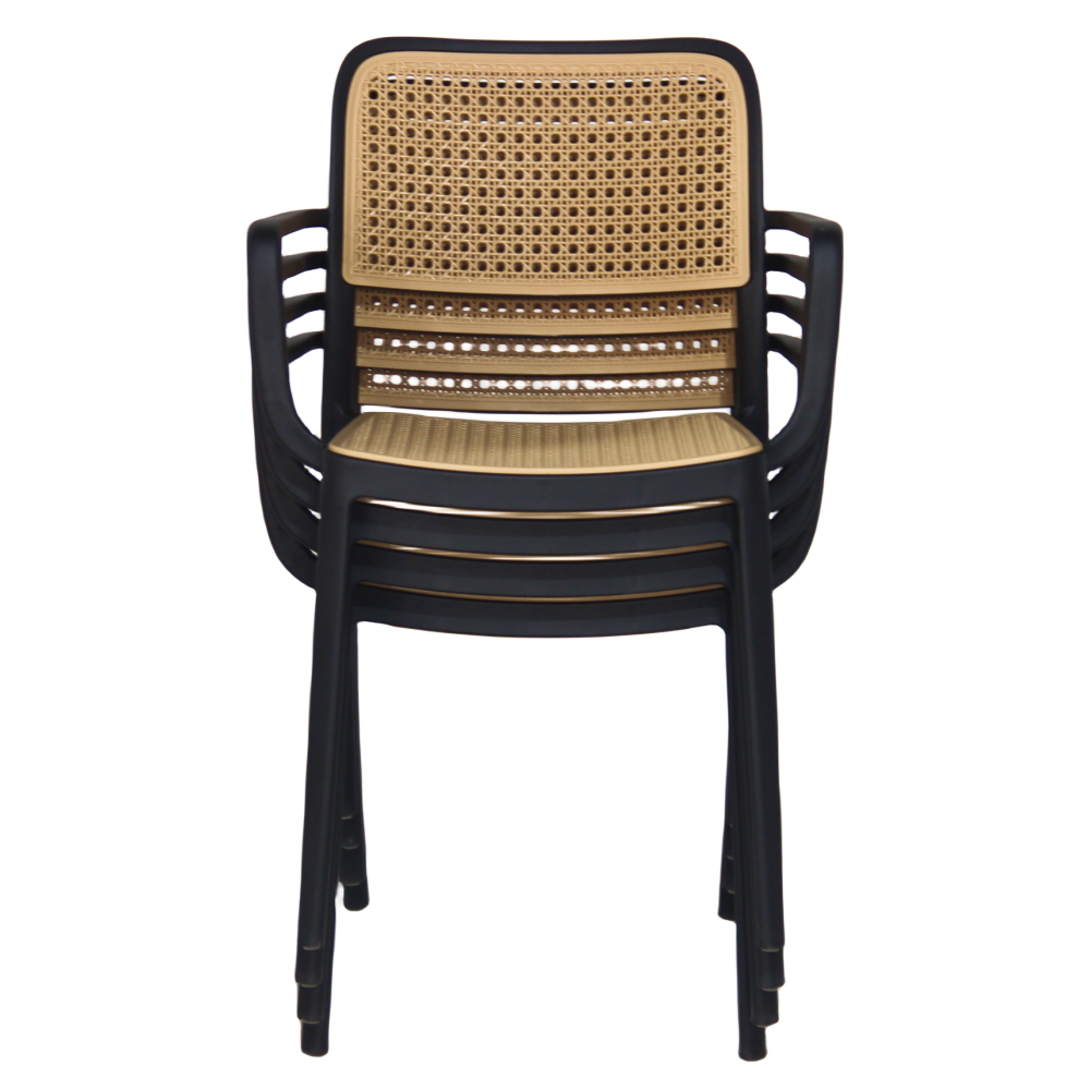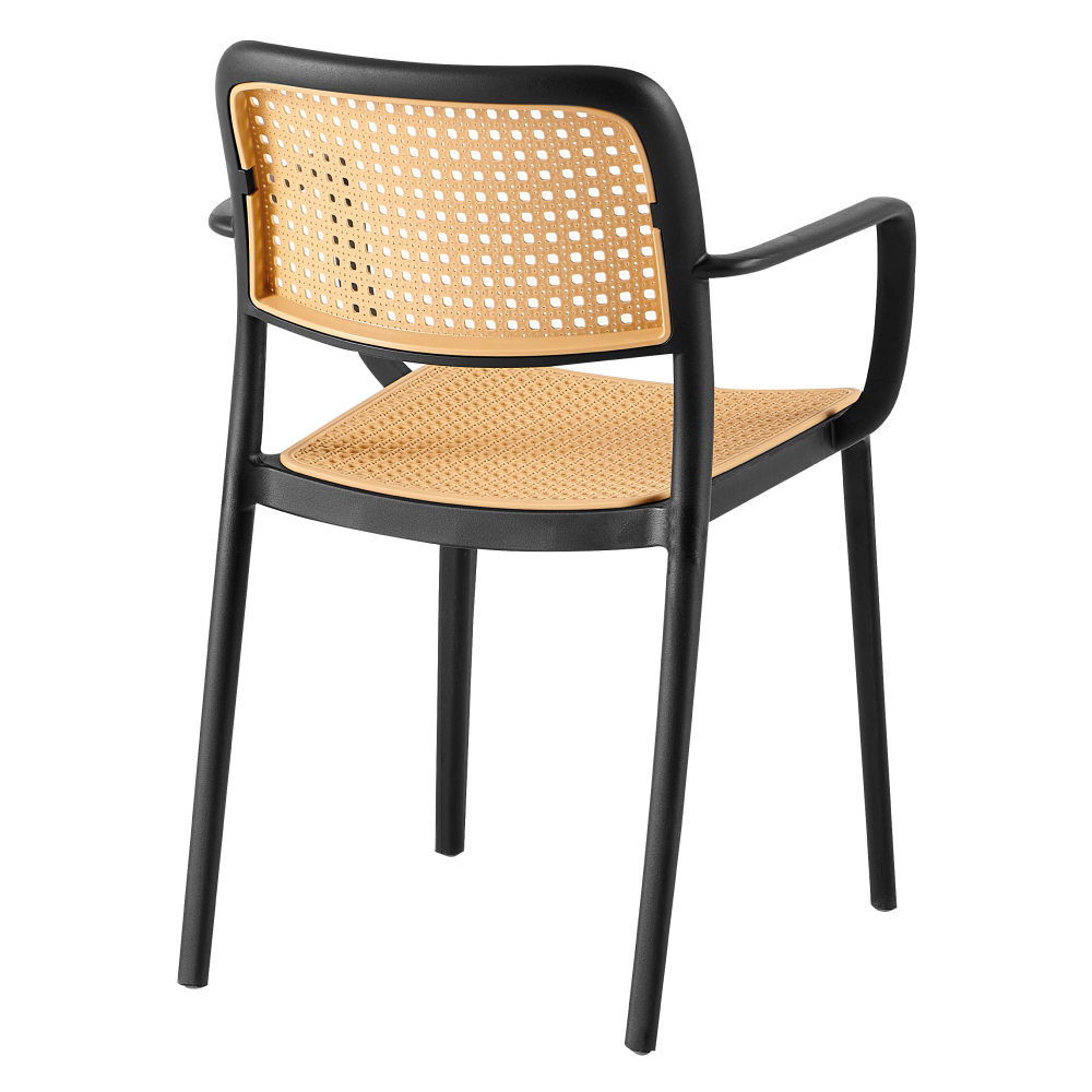 Material: plastic Culoare: neagră / bej Dimensiuni (LxAxÎ): 58x55x81,5 cm Înălţimea scaunului: 46 cm Adâncime scaun: 43 cm Lăţime scaun: 43 cm Înălţime spătar: 39 cm Lăţime spătar: 43 cm Capacitate de încărcare: 100 kg Greutate: 5,25 kg Stivuibil Potrivit pentru interior şi exterior Livrat asamblat