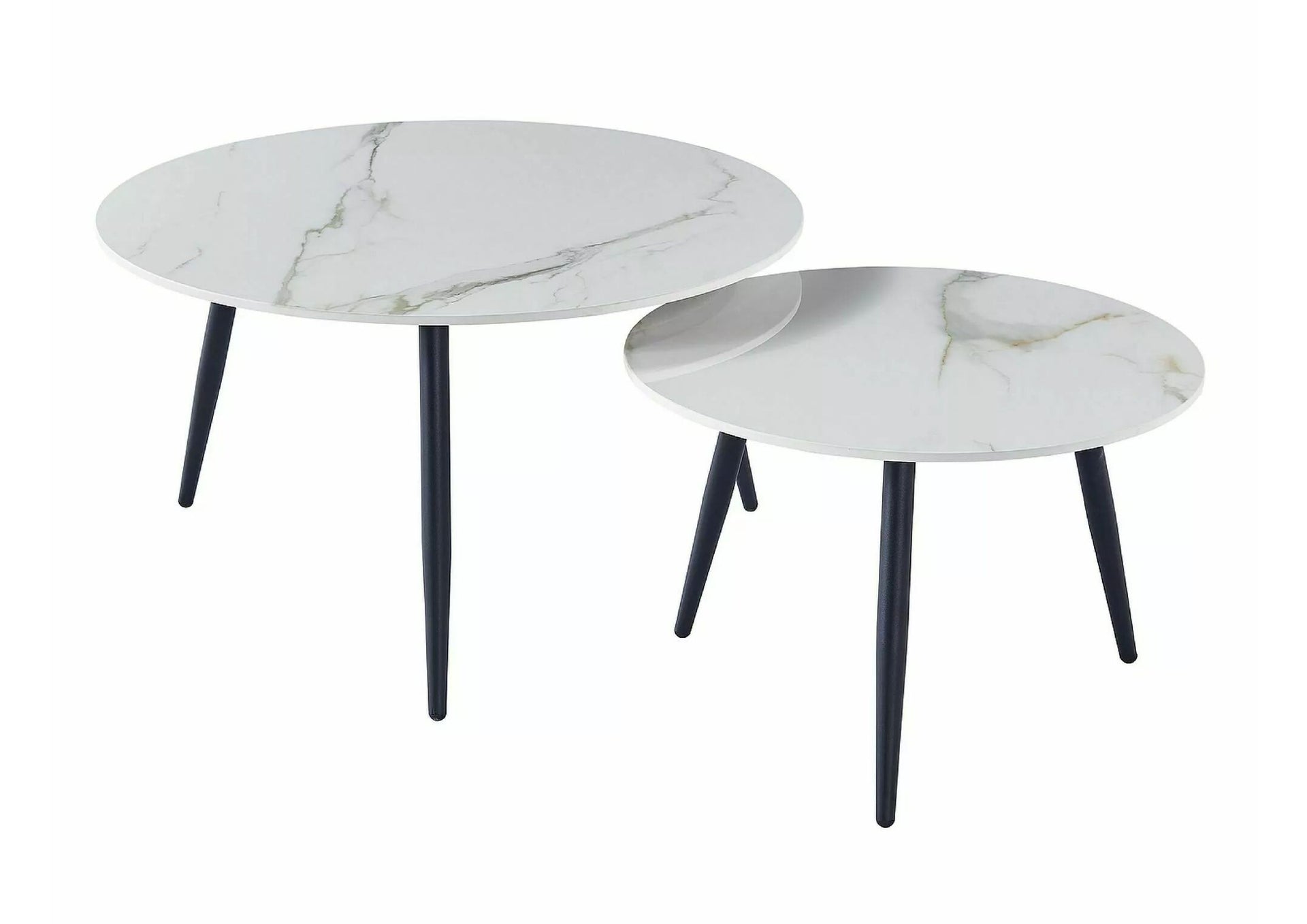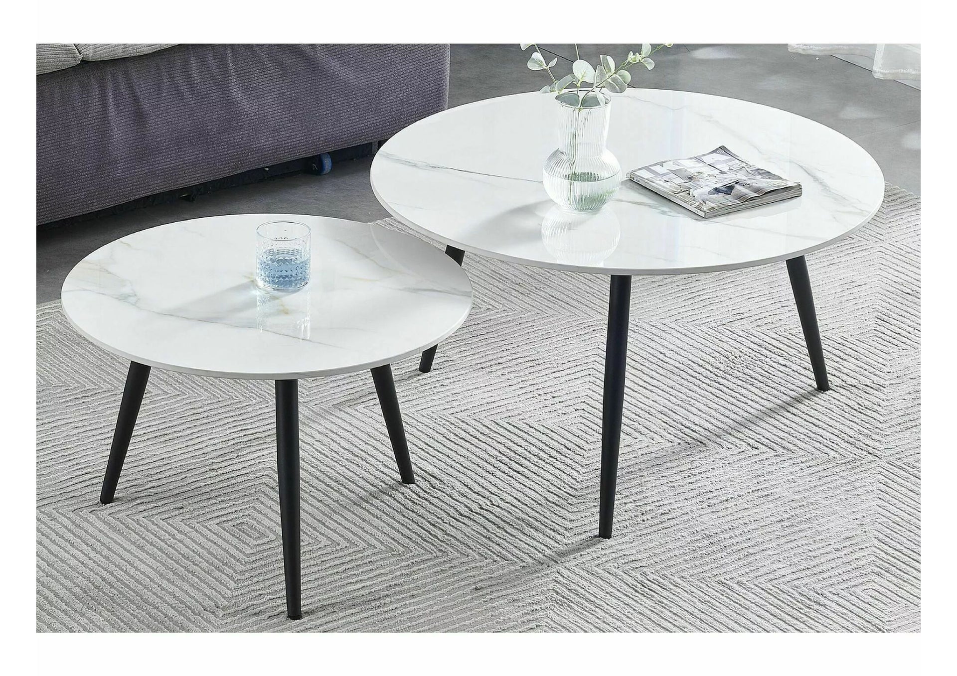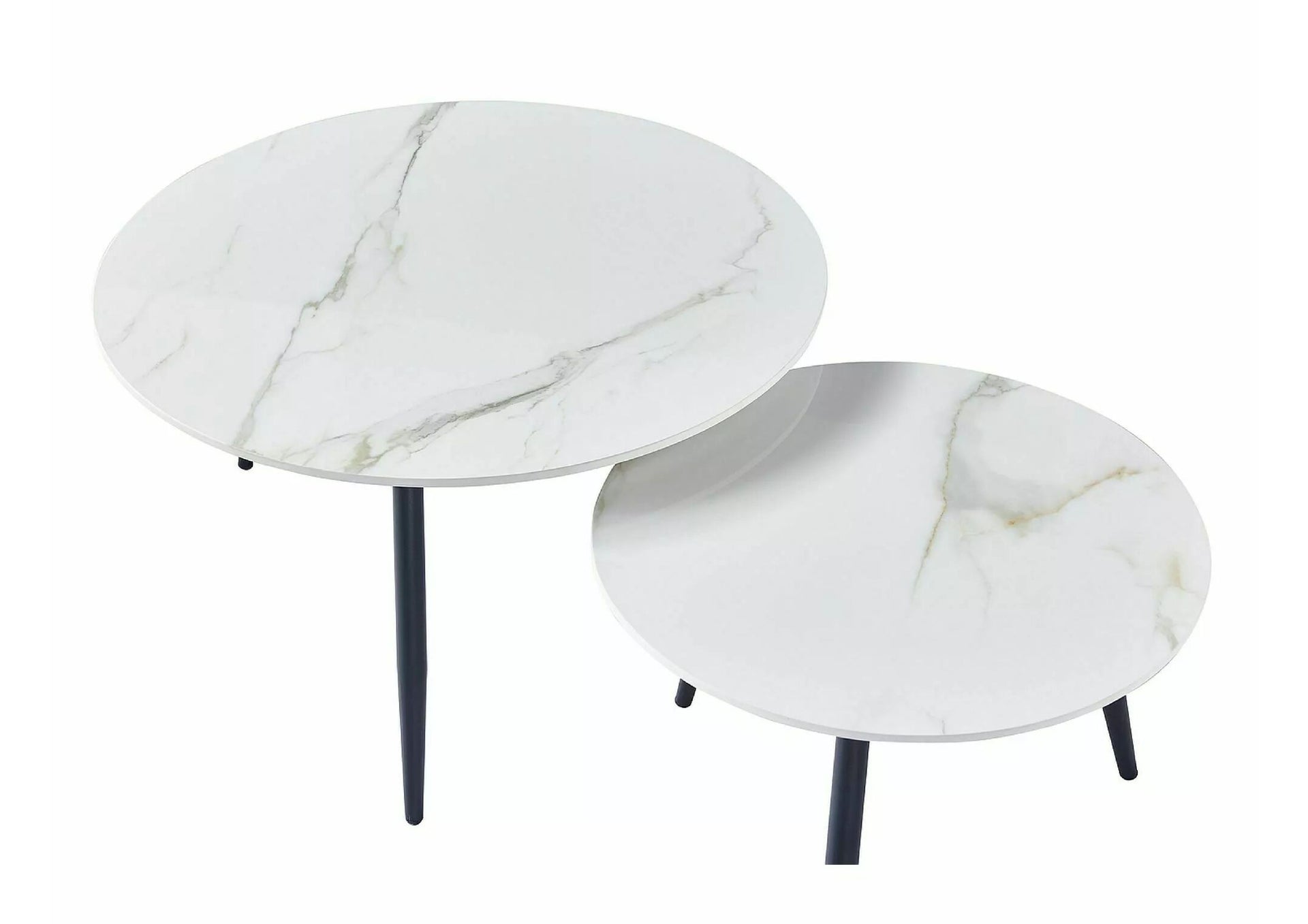 Set bănci, blat: ceramică, cadru: metal, culoare: alb, efect marmură / negru mat. Dimensiunile mesei mai mici: diametru 60; înălțime: 40 cm.