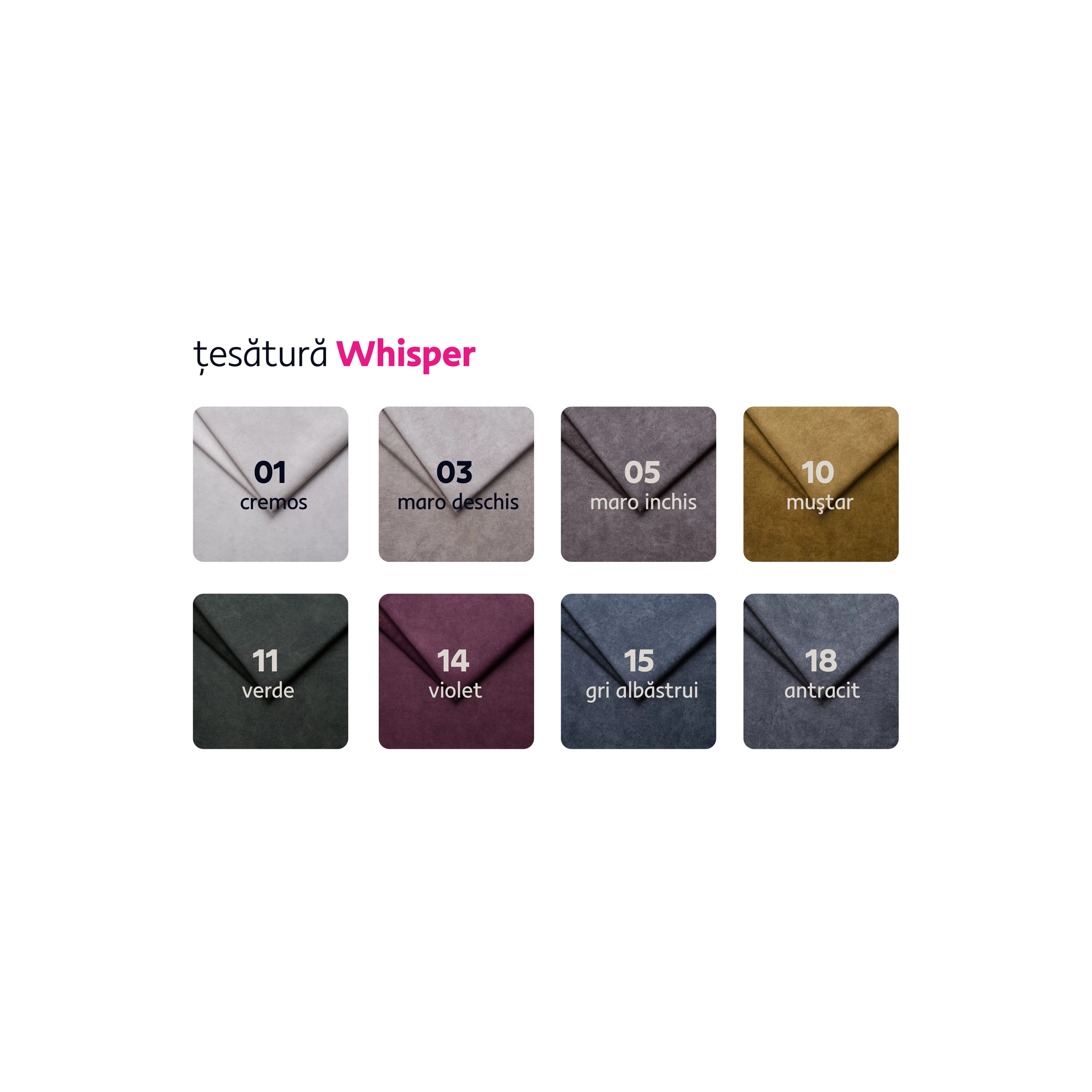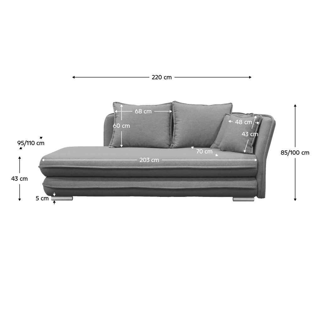Material: ţesătură Whisper 17 Culoare: gri Dimensiuni (LxAxÎ): 220x110x85/100 cm Înălţime scaun: 43 cm Adâncime scaun: 70/95 cm Picioare din plastic Culoare picioare: argintie Înălţimea spaţiului inferior de la podea: 5 cm Suprafaţa pentru dormit (LxL): 95x203 cm Capacitate de susţinere: 100 kg Complet tapiţat Cu spaţiu de depozitare Pernele sunt incluse Dimensiunea pernei mari (LxA): 68x60 cm Dimensiunea pernei mici (LxA): 48x43 cm Variantă pentru partea dreaptă Livrat dezasamblat Vă oferim posibilitatea de a comanda şezlongul în 8 variante de culoare ale materialului Whisper, la preţul de: 3 739,-. Pentru comenzi personalizate este necesară plata unui avans de 10% din suma totală. După achitarea avansului, comanda dumneavoastră va intra în producţie. Termenul de livrare este de 6-8 săptămâni.